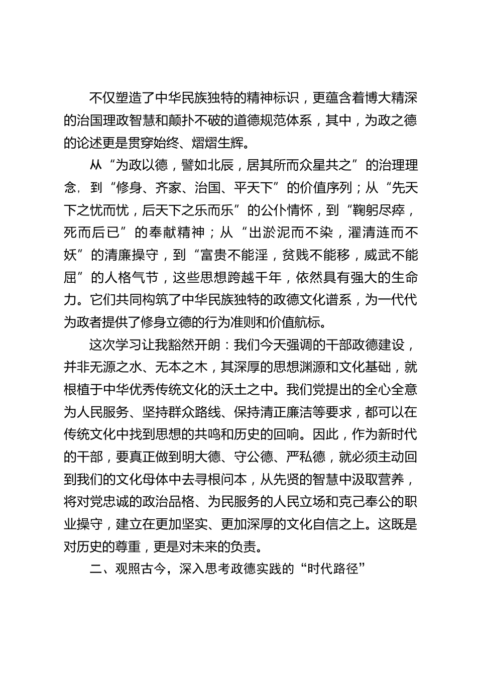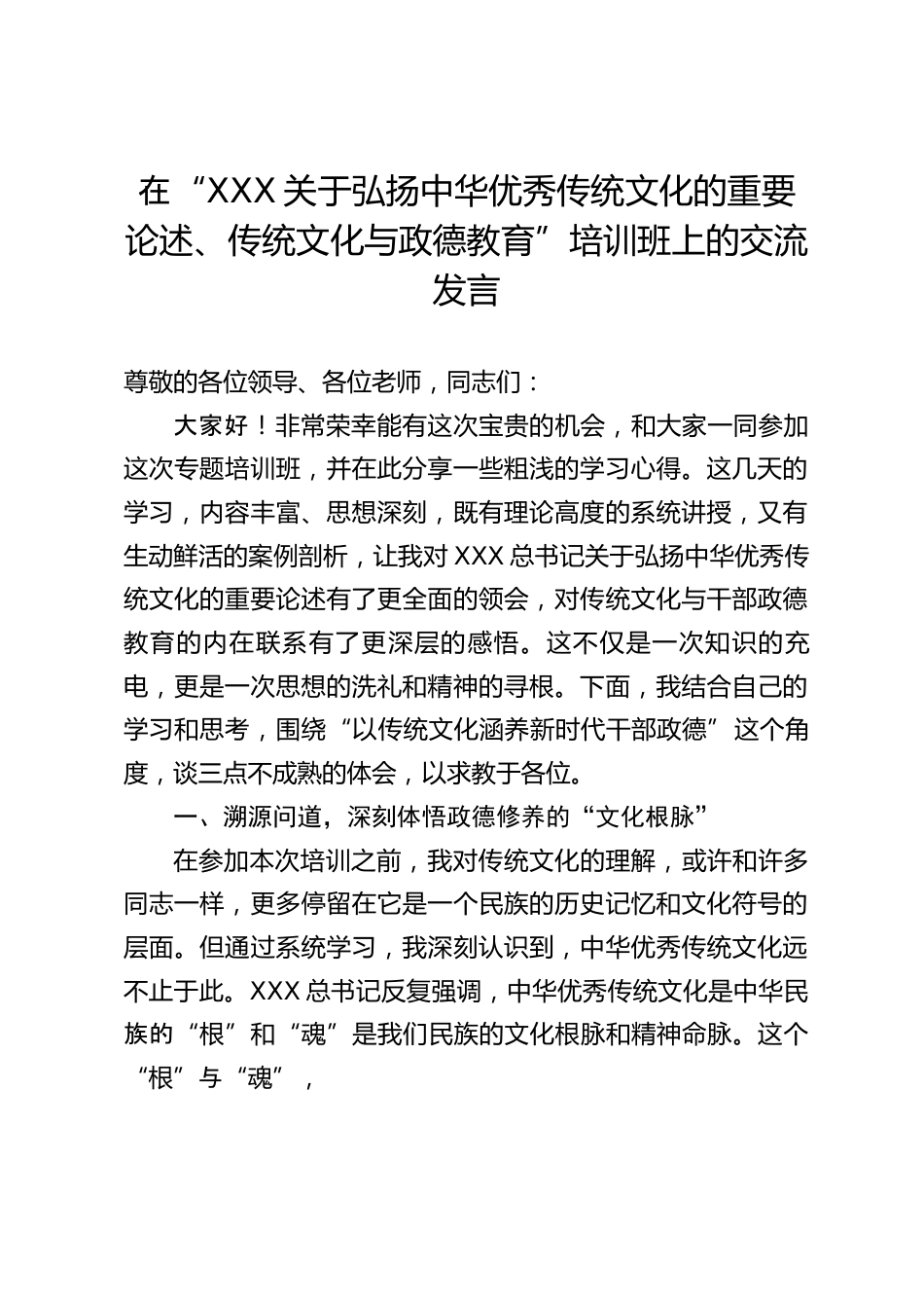 在“XXX關(guān)于弘揚中華優(yōu)秀傳統(tǒng)文化的重要論述、傳統(tǒng)文化與政德教育”培訓(xùn)班上的交流發(fā)言尊敬的各位領(lǐng)導(dǎo)、各位老師,同志們:大家好!非常榮幸能有這次寶貴的機會,和大家一同參加這次專題培訓(xùn)班,并在此分享一些粗淺的學(xué)習(xí)心得。這幾天的學(xué)習(xí),內(nèi)容豐富、思想深刻,既有理論高度的系統(tǒng)講授,又有生動鮮活的案例剖析,讓我對XXX總書記關(guān)于弘揚中華優(yōu)秀傳統(tǒng)文化的重要論述有了更全面的領(lǐng)會,對傳統(tǒng)文化與干部政德教育的內(nèi)在聯(lián)系有了更深層的感悟。這不僅是一次知識的充電,更是一次思想的洗禮和精神的尋根。下面,我結(jié)合自己的學(xué)習(xí)和思考,圍繞“以傳統(tǒng)文化涵養(yǎng)新時代干部政...