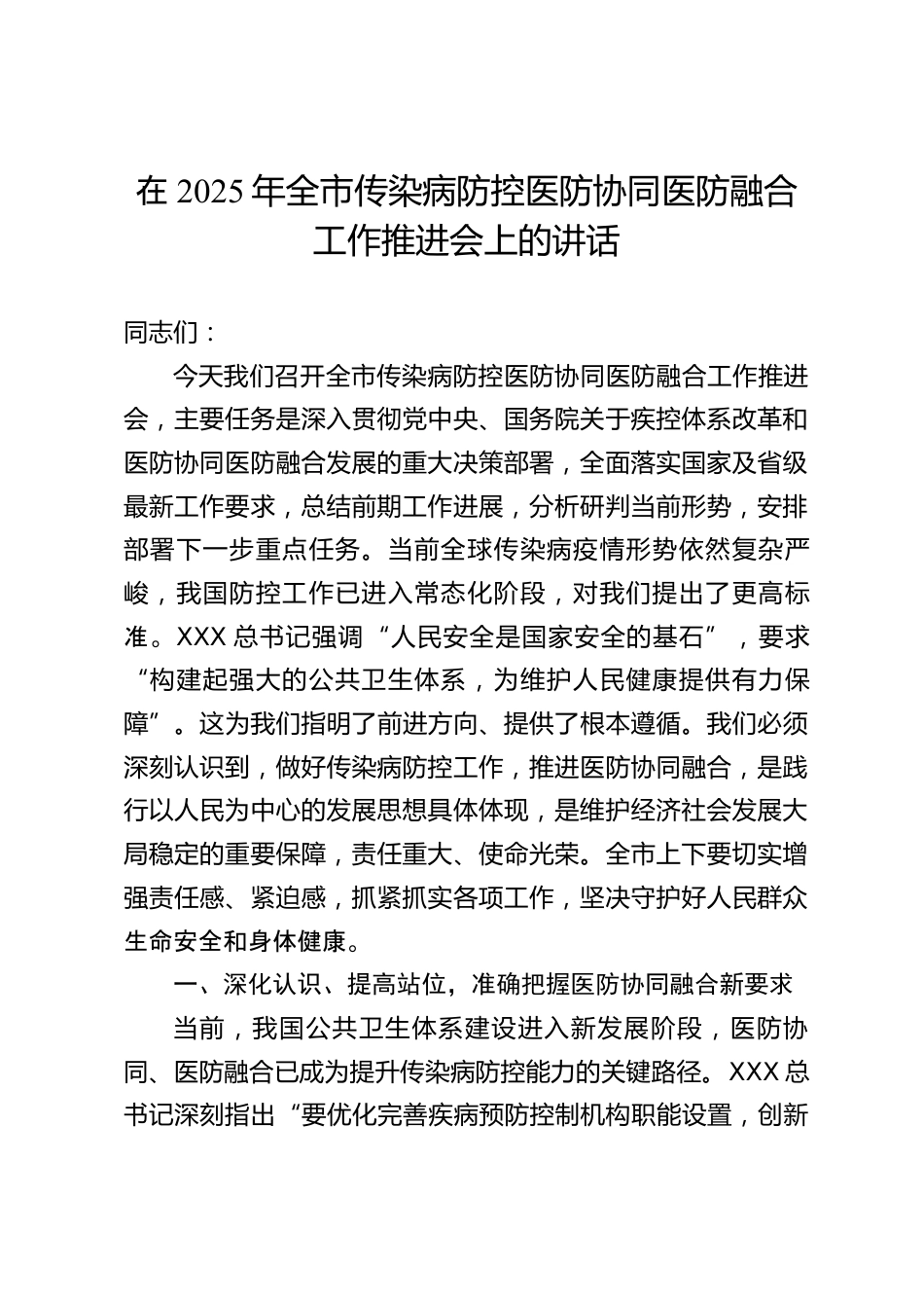 在2025年全市傳染病防控醫(yī)防協(xié)同醫(yī)防融合工作推進(jìn)會(huì)上的講話(huà)同志們:今天我們召開(kāi)全市傳染病防控醫(yī)防協(xié)同醫(yī)防融合工作推進(jìn)會(huì),主要任務(wù)是深入貫徹黨中央、國(guó)務(wù)院關(guān)于疾控體系改革和醫(yī)防協(xié)同醫(yī)防融合發(fā)展的重大決策部署,全面落實(shí)國(guó)家及省級(jí)最新工作要求,總結(jié)前期工作進(jìn)展,分析研判當(dāng)前形勢(shì),安排部署下一步重點(diǎn)任務(wù)。當(dāng)前全球傳染病疫情形勢(shì)依然復(fù)雜嚴(yán)峻,我國(guó)防控工作已進(jìn)入常態(tài)化階段,對(duì)我們提出了更高標(biāo)準(zhǔn)。XXX總書(shū)記強(qiáng)調(diào)“人民安全是國(guó)家安全的基石”,要求“構(gòu)建起強(qiáng)大的公共衛(wèi)生體系,為維護(hù)人民健康提供有力保障”。這為我們指明了前進(jìn)方向、提供了根本遵循。...