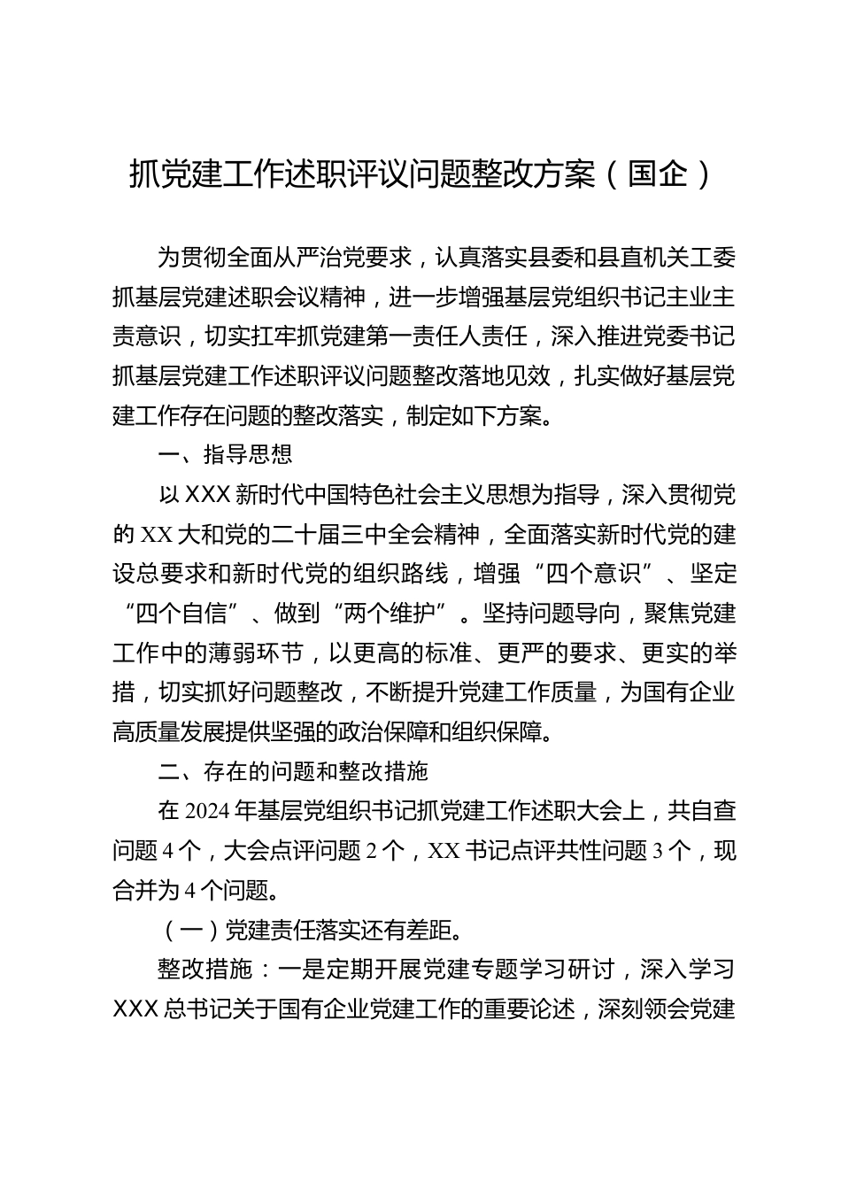 抓黨建工作述職評議問題整改方案(國企)為貫徹全面從嚴(yán)治黨要求,認(rèn)真落實縣委和縣直機(jī)關(guān)工委抓基層黨建述職會議精神,進(jìn)一步增強(qiáng)基層黨組織書記主業(yè)主責(zé)意識,切實扛牢抓黨建第一責(zé)任人責(zé)任,深入推進(jìn)黨委書記抓基層黨建工作述職評議問題整改落地見效,扎實做好基層黨建工作存在問題的整改落實,制定如下方案。一、指導(dǎo)思想以XXX新時代中國特色社會主義思想為指導(dǎo),深入貫徹黨的XX大和黨的二十屆三中全會精神,全面落實新時代黨的建設(shè)總要求和新時代黨的組織路線,增強(qiáng)“四個意識”、堅定“四個自信”、做到“兩個維護(hù)”。堅持問題導(dǎo)向,聚焦黨建工作中的薄弱環(huán)節(jié),以...