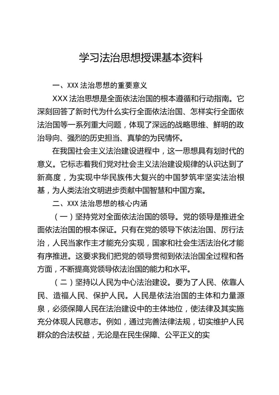 學(xué)習(xí)法治思想授課基本資料一、XXX法治思想的重要意義XXX法治思想是全面依法治國(guó)的根本遵循和行動(dòng)指南。它深刻回答了新時(shí)代為什么實(shí)行全面依法治國(guó)、怎樣實(shí)行全面依法治國(guó)等一系列重大問(wèn)題,體現(xiàn)了深遠(yuǎn)的戰(zhàn)略思維、鮮明的政治導(dǎo)向、強(qiáng)烈的歷史擔(dān)當(dāng)、真摯的為民情懷。在我國(guó)社會(huì)主義法治建設(shè)進(jìn)程中,這一思想具有劃時(shí)代的意義。它標(biāo)志著我們黨對(duì)社會(huì)主義法治建設(shè)規(guī)律的認(rèn)識(shí)達(dá)到了新高度,為實(shí)現(xiàn)中華民族偉大復(fù)興的中國(guó)夢(mèng)筑牢堅(jiān)實(shí)法治根基,為人類(lèi)法治文明進(jìn)步貢獻(xiàn)中國(guó)智慧和中國(guó)方案。二、XXX法治思想的核心內(nèi)涵(一)堅(jiān)持黨對(duì)全面依法治國(guó)的領(lǐng)導(dǎo)。黨的領(lǐng)導(dǎo)是推進(jìn)全面依法...