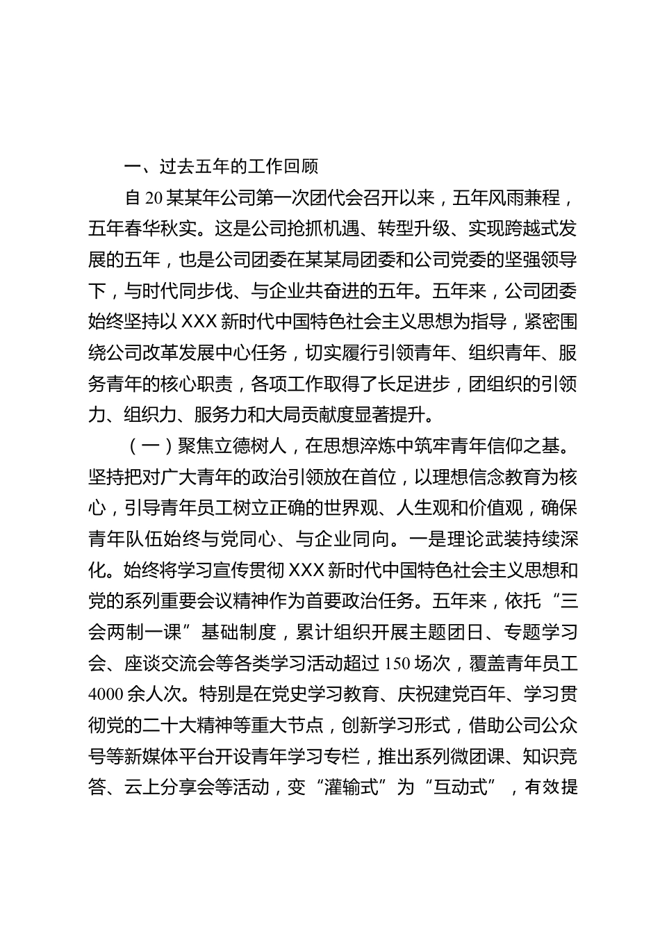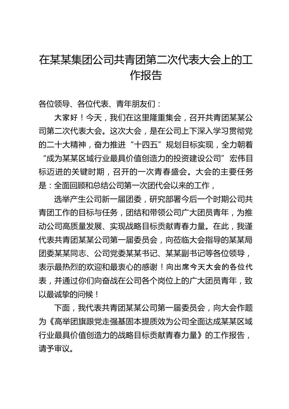 在某某集團(tuán)公司共青團(tuán)第二次代表大會(huì)上的工作報(bào)告各位領(lǐng)導(dǎo)、各位代表、青年朋友們:大家好!今天,我們?cè)谶@里隆重集會(huì),召開共青團(tuán)某某公司第二次代表大會(huì)。這次大會(huì),是在公司上下深入學(xué)習(xí)貫徹黨的二十大精神,奮力推進(jìn)“十四五”規(guī)劃目標(biāo)實(shí)現(xiàn),全力朝著“成為某某區(qū)域行業(yè)最具價(jià)值創(chuàng)造力的投資建設(shè)公司”宏偉目標(biāo)邁進(jìn)的關(guān)鍵時(shí)期,召開的一次青春盛會(huì)。大會(huì)的主要任務(wù)是:全面回顧和總結(jié)公司第一次團(tuán)代會(huì)以來的工作,選舉產(chǎn)生公司新一屆團(tuán)委,研究部署今后一個(gè)時(shí)期公司共青團(tuán)工作的目標(biāo)與任務(wù),團(tuán)結(jié)和帶領(lǐng)公司廣大團(tuán)員青年,為推動(dòng)公司高質(zhì)量發(fā)展、實(shí)現(xiàn)戰(zhàn)略目標(biāo)貢獻(xiàn)青春...