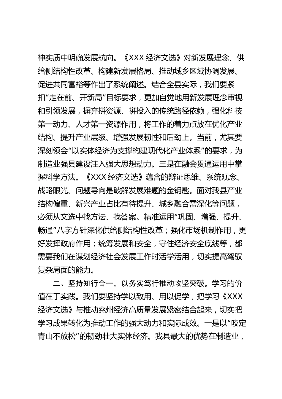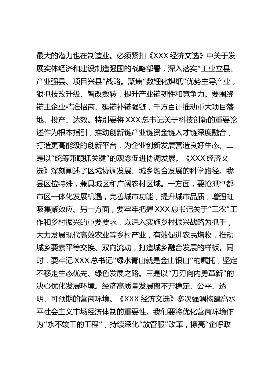(14篇)學(xué)習(xí)《經(jīng)濟(jì)文選》研討發(fā)言心得體會(huì)匯編《XXX經(jīng)濟(jì)文選》研討發(fā)言:持續(xù)在學(xué)深悟透、融會(huì)貫通、知行合一上下功夫《XXX經(jīng)濟(jì)文選》是新時(shí)代中國特色社會(huì)主義經(jīng)濟(jì)思想的集大成之作,深刻回答了事關(guān)我國經(jīng)濟(jì)發(fā)展全局的一系列重大理論和實(shí)踐問題,為我們?cè)谛抡鞒躺贤苿?dòng)高質(zhì)量發(fā)展提供了根本遵循和行動(dòng)指南。接下來,結(jié)合全縣工作實(shí)際,談幾點(diǎn)學(xué)習(xí)思考和體會(huì)。不當(dāng)之處,敬請(qǐng)批評(píng)指正。一、深悟思想偉力,以理論清醒筑牢發(fā)展根基?!禭XX經(jīng)濟(jì)文選》通篇貫穿著對(duì)中國經(jīng)濟(jì)發(fā)展階段性特征的深刻洞察,蘊(yùn)含著推動(dòng)高質(zhì)量發(fā)展的科學(xué)方法論。我們必須深刻領(lǐng)悟其核心要義,用以武裝...