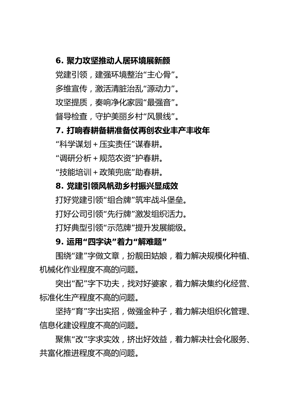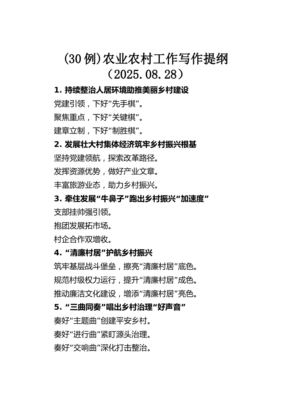 (30例)農(nóng)業(yè)農(nóng)村工作寫作提綱(2025.08.28)1.持續(xù)整治人居環(huán)境助推美麗鄉(xiāng)村建設(shè)“”黨建引領(lǐng),下好先手棋?!啊本劢怪攸c(diǎn),下好關(guān)鍵棋?!啊苯ㄕ铝⒅?,下好制勝棋。2.發(fā)展壯大村集體經(jīng)濟(jì)筑牢鄉(xiāng)村振興根基堅(jiān)持黨建領(lǐng)航,探索改革路徑。發(fā)揮資源優(yōu)勢(shì),做好產(chǎn)業(yè)文章。豐富旅游業(yè)態(tài),助力鄉(xiāng)村振興。3.“”“”牽住發(fā)展牛鼻子跑出鄉(xiāng)村振興加速度支部掛帥強(qiáng)引領(lǐng)。抱團(tuán)發(fā)展拓市場(chǎng)。村企合作雙增收。4.“”清廉村居護(hù)航鄉(xiāng)村振興“”筑牢基層戰(zhàn)斗堡壘,擦亮清廉村居底色?!啊币?guī)范村級(jí)權(quán)力運(yùn)行,提升清廉村居成色。“”推動(dòng)廉潔文化建設(shè),增添清廉村居亮色。5.“”“”三曲同奏唱出...