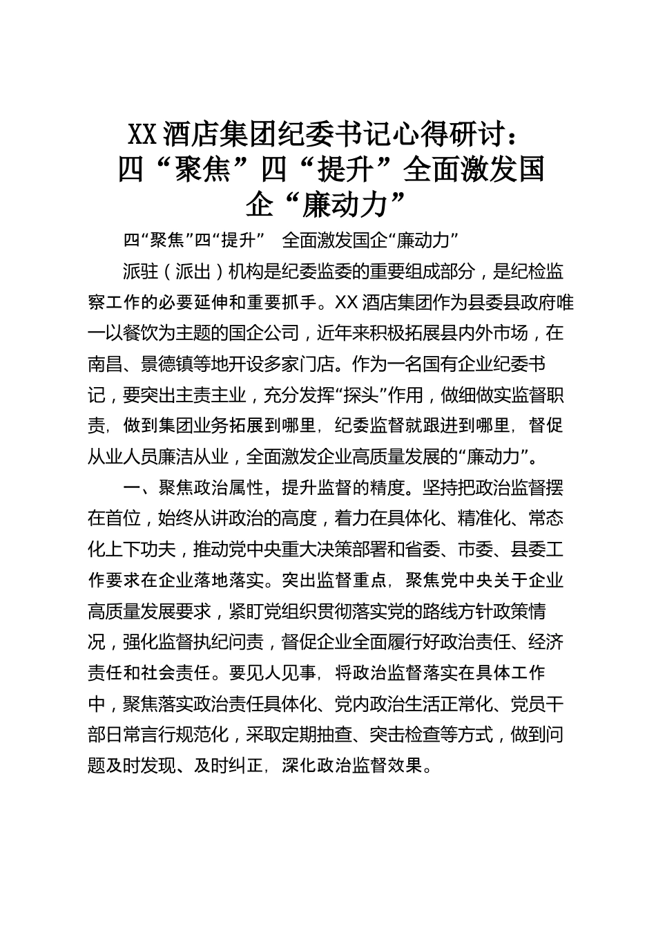 XX酒店集團(tuán)紀(jì)委書記心得研討:四“聚焦”四“提升”全面激發(fā)國企“廉動(dòng)力”“”“”四聚焦四提升“”全面激發(fā)國企廉動(dòng)力派駐(派出)機(jī)構(gòu)是紀(jì)委監(jiān)委的重要組成部分,是紀(jì)檢監(jiān)察工作的必要延伸和重要抓手。XX酒店集團(tuán)作為縣委縣政府唯一以餐飲為主題的國企公司,近年來積極拓展縣內(nèi)外市場,在南昌、景德鎮(zhèn)等地開設(shè)多家門店。作為一名國有企業(yè)紀(jì)委書“”記,要突出主責(zé)主業(yè),充分發(fā)揮探頭作用,做細(xì)做實(shí)監(jiān)督職,做到集拓展到哪里,委督就跟到哪里,督促責(zé)團(tuán)業(yè)務(wù)紀(jì)監(jiān)進(jìn)“”從業(yè)人員廉潔從業(yè),全面激發(fā)企業(yè)高質(zhì)量發(fā)展的廉動(dòng)力。一、聚焦政治屬性,提升監(jiān)督的精度。堅(jiān)持把政治...