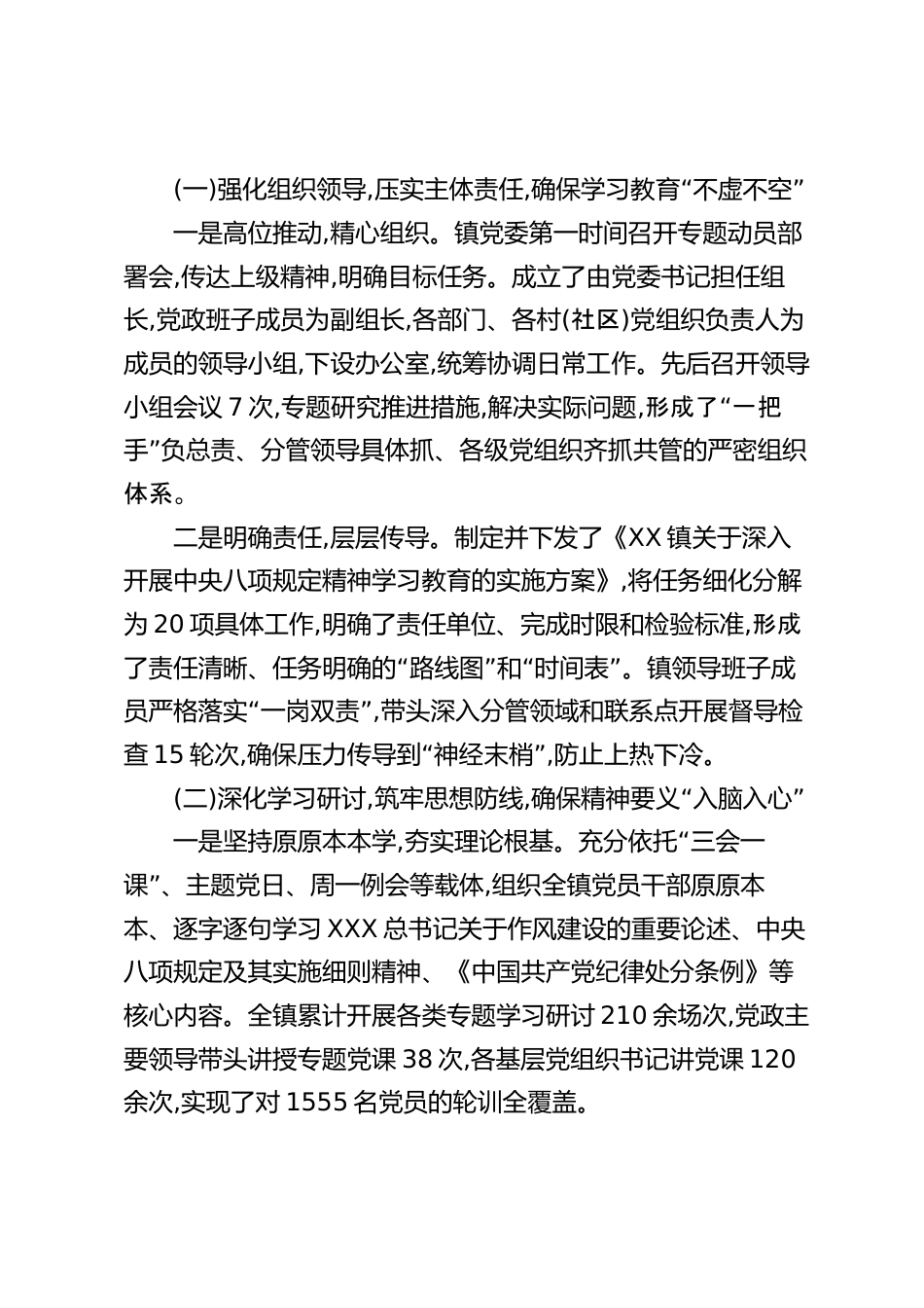 XX縣XX鎮(zhèn)學(xué)習(xí)教育的自查評(píng)估報(bào)告2根據(jù)縣委組織部的統(tǒng)一部署與要求,我鎮(zhèn)黨委以高度的政治自覺和強(qiáng)烈的責(zé)任擔(dān)當(dāng),扎實(shí)有序地開展了為期數(shù)月的中央八項(xiàng)規(guī)定精神學(xué)習(xí)教育活動(dòng)。本次學(xué)習(xí)教育旨在推動(dòng)全鎮(zhèn)黨員干部隊(duì)伍作風(fēng)建設(shè)常態(tài)化長(zhǎng)效化,進(jìn)一步鞏固拓展風(fēng)清氣正的政治生態(tài)?,F(xiàn)將我鎮(zhèn)學(xué)習(xí)教育的整體情況、主要做法、取得成效以及存在問題與未來規(guī)劃,作如下自查評(píng)估報(bào)告。一、基本情況自學(xué)習(xí)教育啟動(dòng)以來,XX鎮(zhèn)黨委始終將其作為一項(xiàng)重大的政治任務(wù)來抓,堅(jiān)持高起點(diǎn)謀劃、高標(biāo)準(zhǔn)推進(jìn)、高質(zhì)量落實(shí)。全鎮(zhèn)共計(jì)35個(gè)基層黨組織、1555名黨員實(shí)現(xiàn)了學(xué)習(xí)教育全覆蓋,參與率達(dá)到100%。鎮(zhèn)黨委...