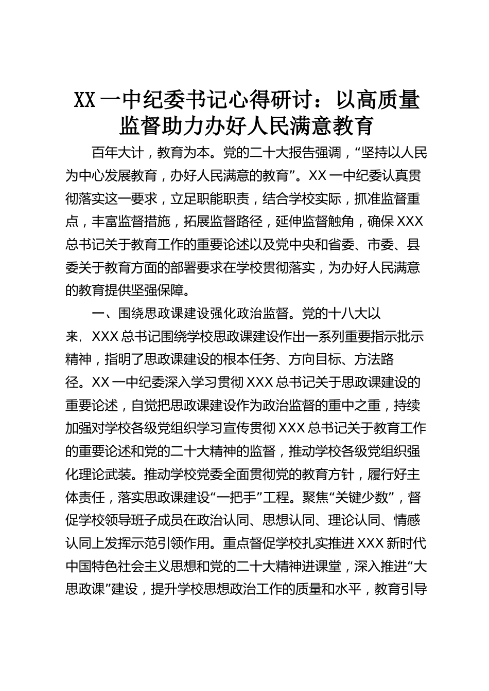 XX一中紀(jì)委書記心得研討:以高質(zhì)量監(jiān)督助力辦好人民滿意教育“百年大計(jì),教育為本。黨的二十大報(bào)告強(qiáng)調(diào),堅(jiān)持以人民”為中心發(fā)展教育,辦好人民滿意的教育。XX一中紀(jì)委認(rèn)真貫徹落實(shí)這一要求,立足職能職責(zé),結(jié)合學(xué)校實(shí)際,抓準(zhǔn)監(jiān)督重點(diǎn),豐富監(jiān)督措施,拓展監(jiān)督路徑,延伸監(jiān)督觸角,確保XXX總書記關(guān)于教育工作的重要論述以及黨中央和省委、市委、縣委關(guān)于教育方面的部署要求在學(xué)校貫徹落實(shí),為辦好人民滿意的教育提供堅(jiān)強(qiáng)保障。一、圍繞思政課建設(shè)強(qiáng)化政治監(jiān)督。黨的十八大以來(lái),XXX總書記圍繞學(xué)校思政課建設(shè)作出一系列重要指示批示精神,指明了思政課建設(shè)的根本任務(wù)、方...