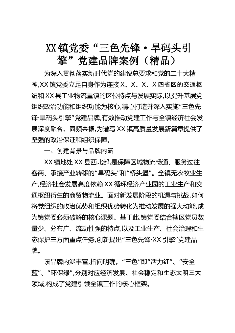 XX鎮(zhèn)黨委“三色先鋒·旱碼頭引擎”黨建品牌案例(精品)為深入貫徹落實新時代黨的建設(shè)總要求和黨的二十大精神,XX鎮(zhèn)黨委立足自身作為連接X、X、X、X四省區(qū)的交通樞紐和XX縣工業(yè)物流重鎮(zhèn)的區(qū)位特點與發(fā)展實際,以提升基層黨組織政治功能和組織功能為核心,“精心打造并深入實施三色先鋒·”旱碼頭引擎黨建品牌,有效推動黨建工作與全鎮(zhèn)經(jīng)濟社會發(fā)展深度融合、同頻共振,為譜寫XX鎮(zhèn)高質(zhì)量發(fā)展新篇章提供了堅強的政治保證和組織保障。一、創(chuàng)建背景與品牌內(nèi)涵XX鎮(zhèn)地處XX縣西北部,是保障區(qū)域物流暢通、服務(wù)過往“”“”客商、承接產(chǎn)業(yè)轉(zhuǎn)移的旱碼頭和橋頭堡。全鎮(zhèn)無農(nóng)牧業(yè)生產(chǎn),經(jīng)濟...