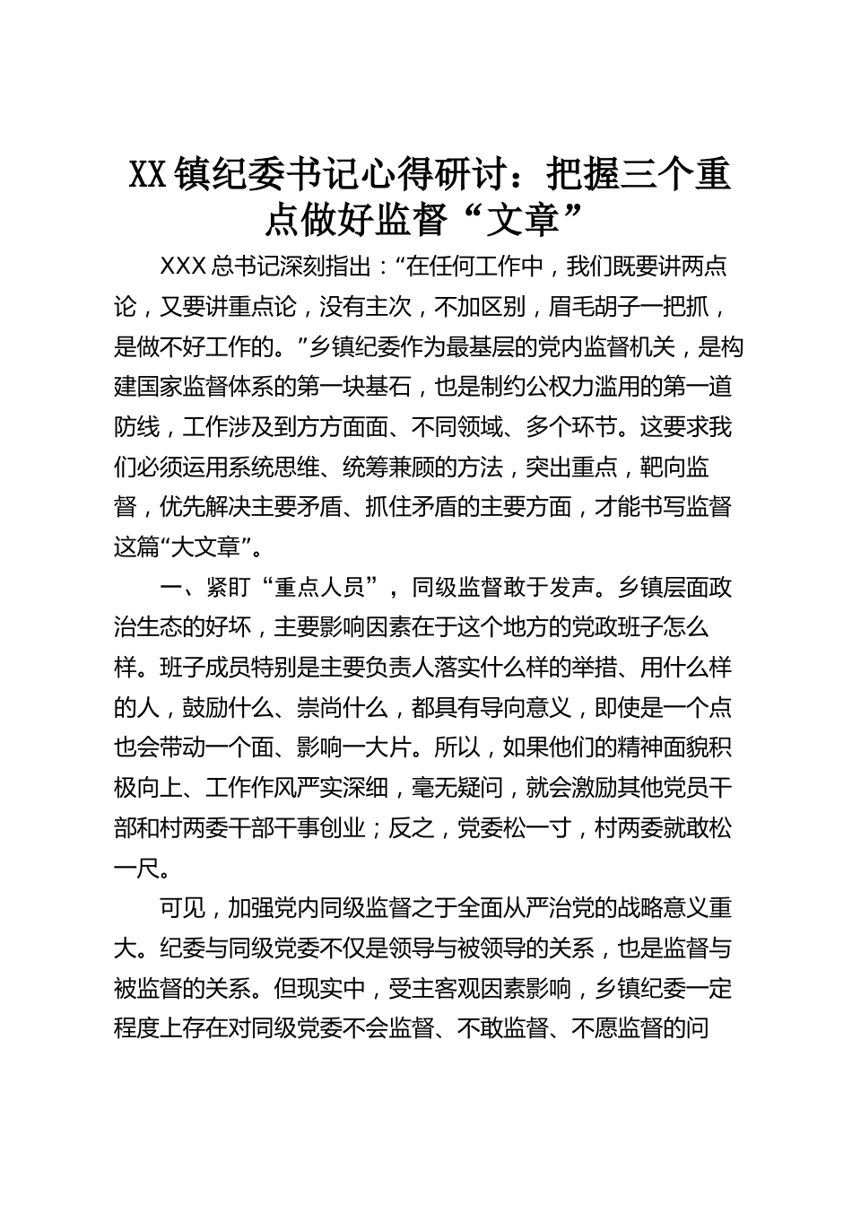 XX鎮(zhèn)紀(jì)委書(shū)記心得研討:把握三個(gè)重點(diǎn) 做好監(jiān)督“文章”