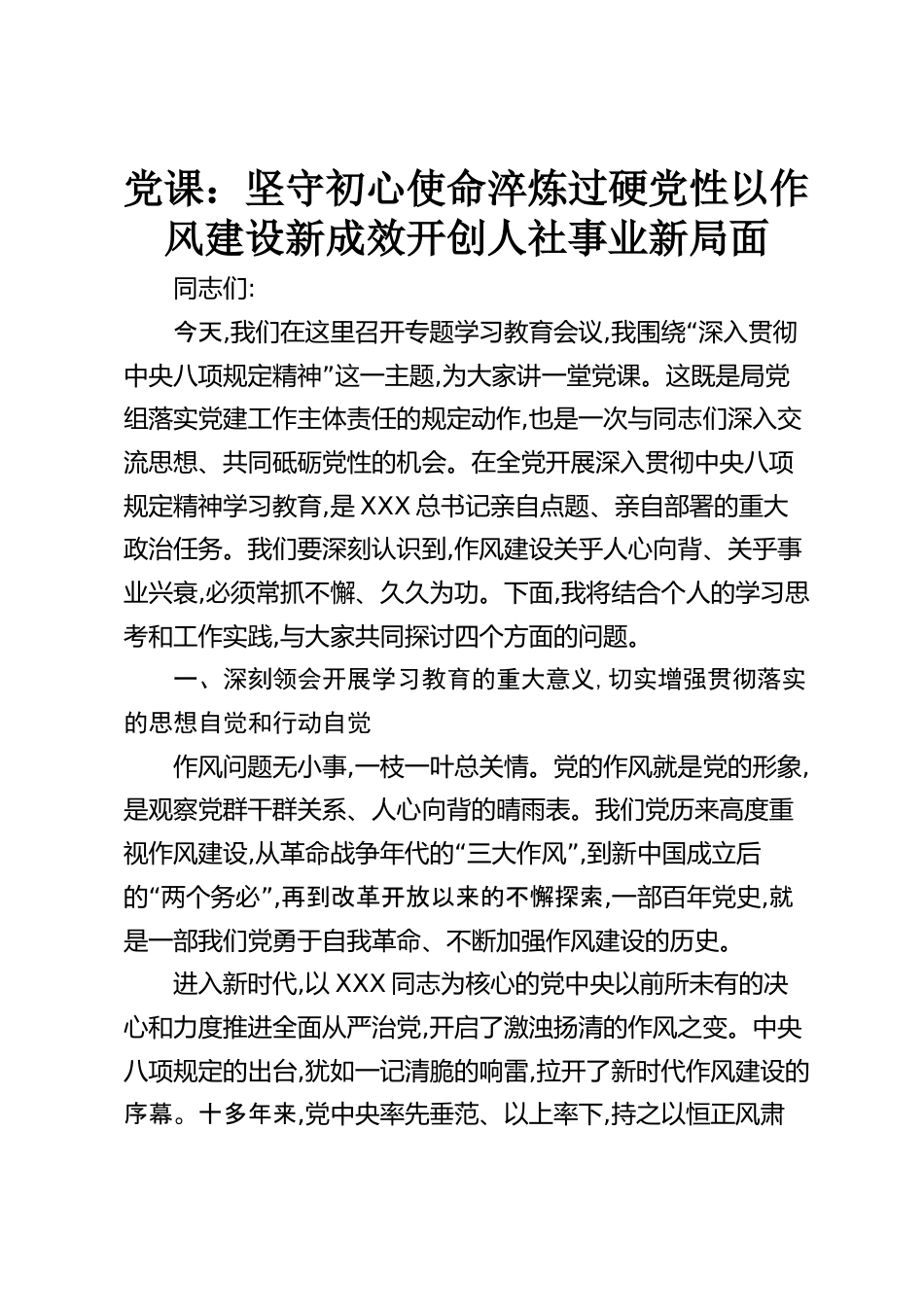 黨課:堅守初心使命淬煉過硬黨性以作風建設(shè)新成效開創(chuàng)人社事業(yè)新局面同志們:今天,我們在這里召開專題學(xué)習教育會議,“我圍繞深入貫徹”中央八項規(guī)定精神這一主題,為大家講一堂黨課。這既是局黨組落實黨建工作主體責任的規(guī)定動作,也是一次與同志們深入交流思想、共同砥礪黨性的機會。在全黨開展深入貫徹中央八項規(guī)定精神學(xué)習教育,是XXX總書記親自點題、親自部署的重大政治任務(wù)。我們要深刻認識到,作風建設(shè)關(guān)乎人心向背、關(guān)乎事業(yè)興衰,必須常抓不懈、久久為功。下面,我將結(jié)合個人的學(xué)習思考和工作實踐,與大家共同探討四個方面的問題。一、深刻領(lǐng)會開展學(xué)習教育的重大意義,切...