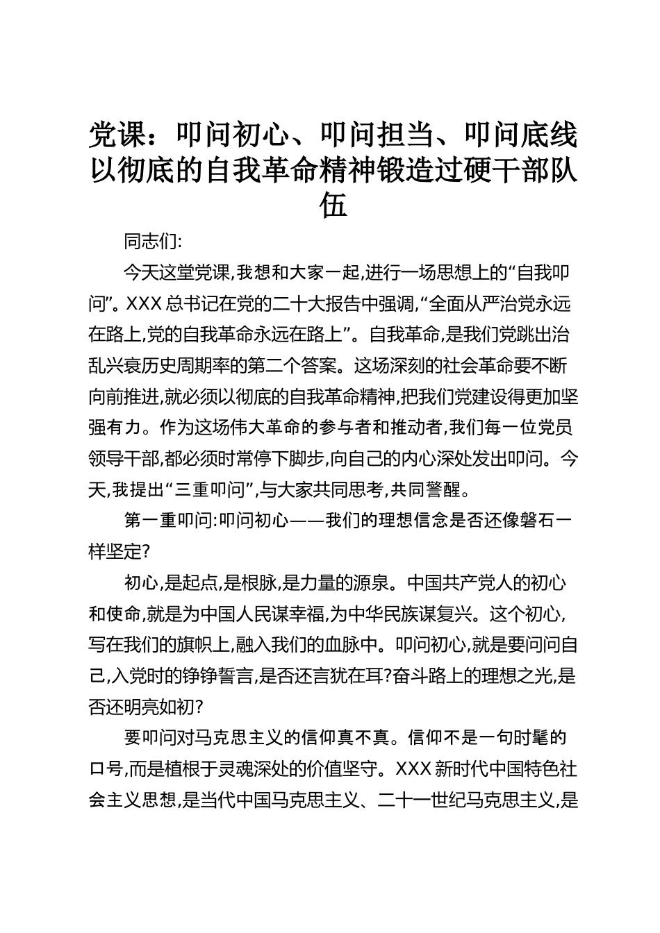 黨課:叩問(wèn)初心、叩問(wèn)擔(dān)當(dāng)、叩問(wèn)底線以徹底的自我革命精神鍛造過(guò)硬干部隊(duì)伍同志們:今天這堂黨課,我想和大家一起,“進(jìn)行一場(chǎng)思想上的自我叩”問(wèn)。XXX總書(shū)記在黨的二十大報(bào)告中強(qiáng)調(diào),“全面從嚴(yán)治黨永遠(yuǎn)在路上,”黨的自我革命永遠(yuǎn)在路上。自我革命,是我們黨跳出治亂興衰歷史周期率的第二個(gè)答案。這場(chǎng)深刻的社會(huì)革命要不斷向前推進(jìn),就必須以徹底的自我革命精神,把我們黨建設(shè)得更加堅(jiān)有力。作大革命的參與者和推者強(qiáng)為這場(chǎng)偉動(dòng),我們每一位黨員領(lǐng)導(dǎo)干部,都必須時(shí)常停下腳步,向自己的內(nèi)心深處發(fā)出叩問(wèn)。今天,“”我提出三重叩問(wèn),與大家共同思考,共同警醒。第一重叩問(wèn):——叩初心...