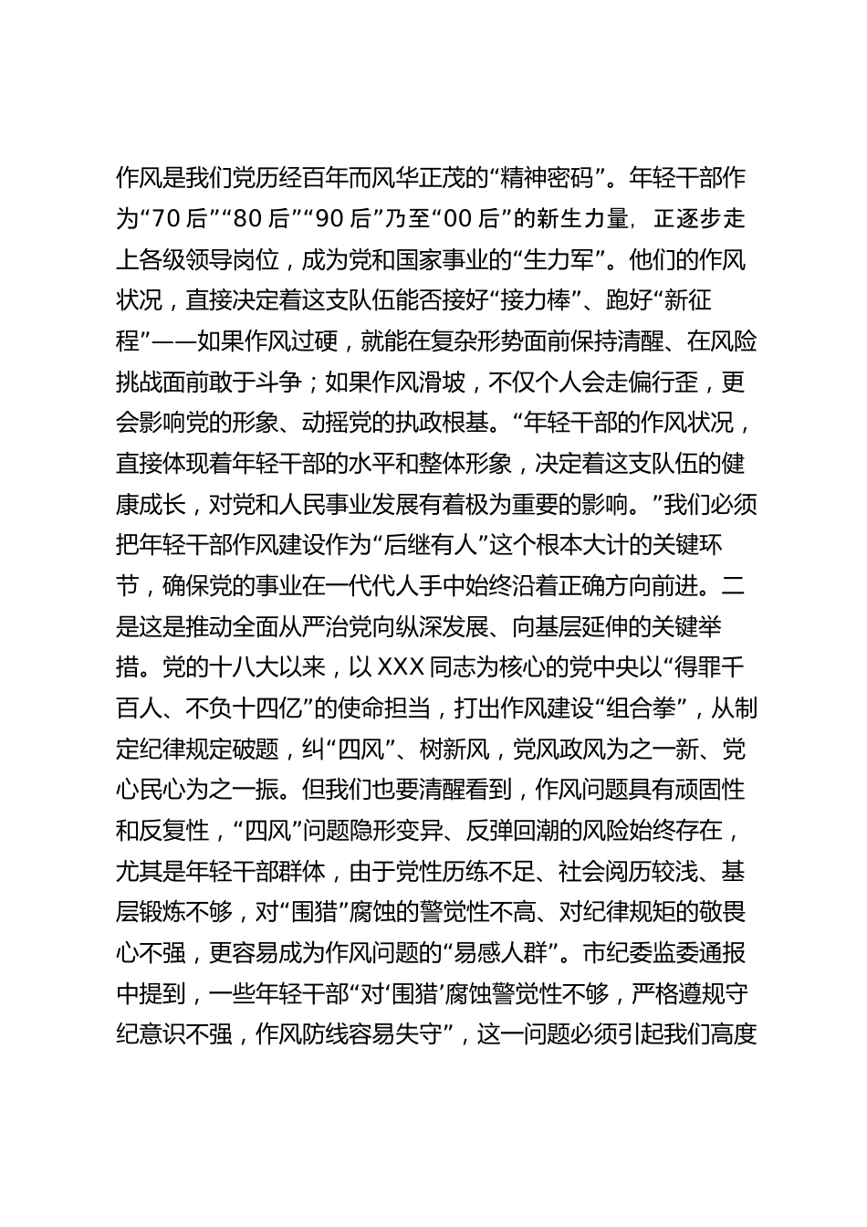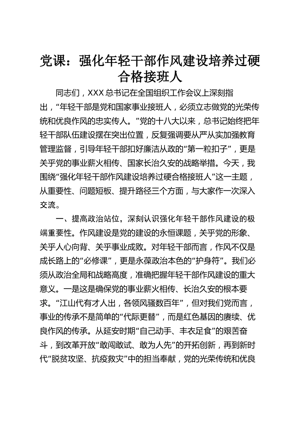 黨課:強化年輕干部作風建設培養(yǎng)過硬合格接班人同志們,XXX總書記在全國組織工作會議上深刻指“出,年輕干部是黨和國家事業(yè)接班人,必須立志做黨的光榮傳”統(tǒng)和優(yōu)良作風的忠實傳人。黨的十八大以來,總書記始終把年輕干部隊伍建設擺在突出位置,反復強調(diào)要從嚴從實加強教育“”管理監(jiān)督,引導年輕干部扣好廉潔從政的第一??圩樱顷P乎黨的事業(yè)薪火相傳、國家長治久安的戰(zhàn)略舉措。今天,我“”圍繞強化年輕干部作風建設培養(yǎng)過硬合格接班人這一主題,從重要性、問題短板、提升路徑三個方面,與大家作一次深入交流。一、提高政治站位,深刻認識強化年輕干部作風建設的極...