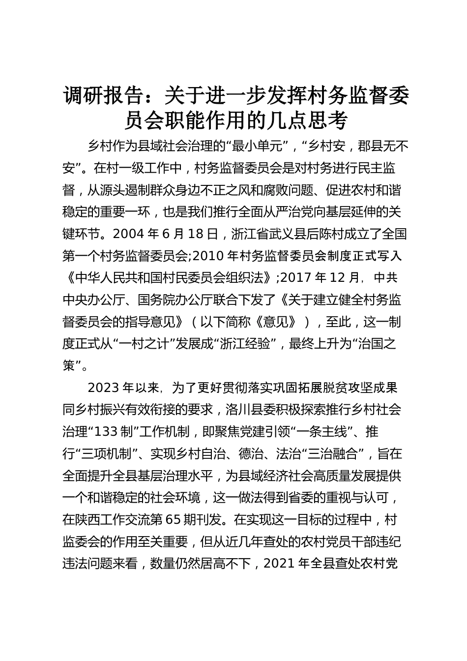 調(diào)研報告:關(guān)于進一步發(fā)揮村務監(jiān)督委員會職能作用的幾點思考