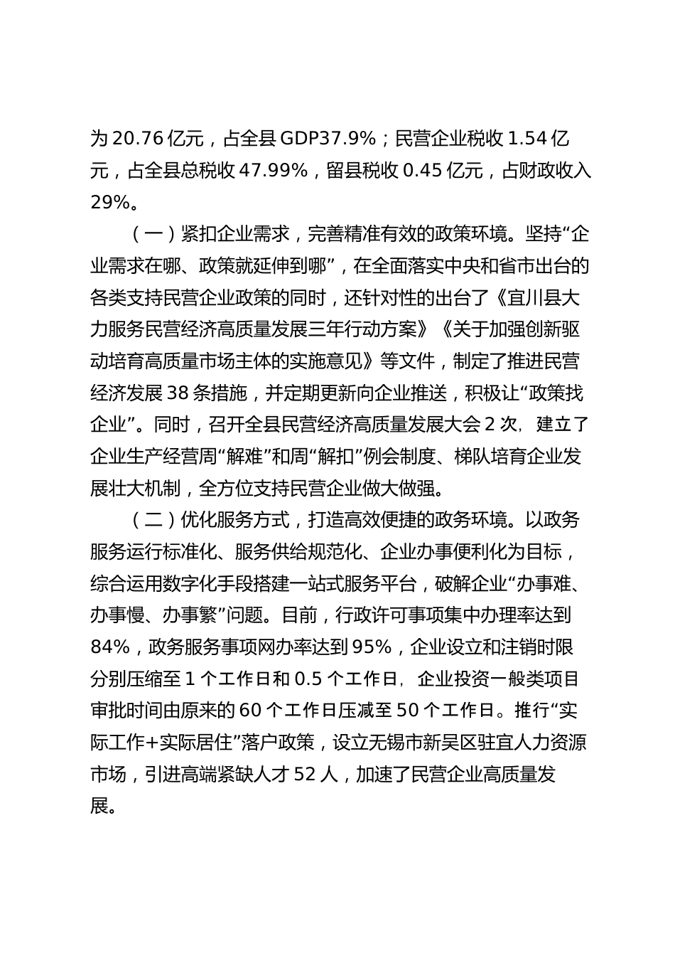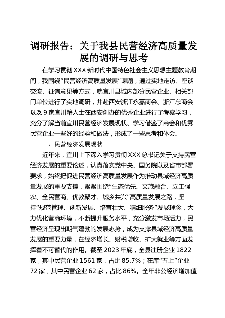 調(diào)研報告:關(guān)于我縣民營經(jīng)濟(jì)高質(zhì)量發(fā)展的調(diào)研與思考在學(xué)習(xí)貫徹XXX新時代中國特色社會主義思想主題教育期“”間,我圍繞民營經(jīng)濟(jì)高質(zhì)量發(fā)展課題,通過實地走訪、座談交流、征詢意見等方式,就宜川縣域內(nèi)部分民營企業(yè)、相關(guān)部門單位進(jìn)行了實地調(diào)研,并赴西安浙江永嘉商會、浙江總商會以及9家宜川籍人士在西安創(chuàng)辦的優(yōu)秀企業(yè)進(jìn)行了考察學(xué)習(xí),充分了解當(dāng)前宜川民營經(jīng)濟(jì)發(fā)展現(xiàn)狀、學(xué)習(xí)借鑒了商會和優(yōu)秀民營企業(yè)一些好的經(jīng)驗和做法,形成了一些思考和體會。一、民營經(jīng)濟(jì)發(fā)展現(xiàn)狀近年來,宜川上下深入學(xué)習(xí)貫徹XXX總書記關(guān)于支持民營經(jīng)濟(jì)發(fā)展的重要論述,認(rèn)真落實黨中央、國務(wù)院...