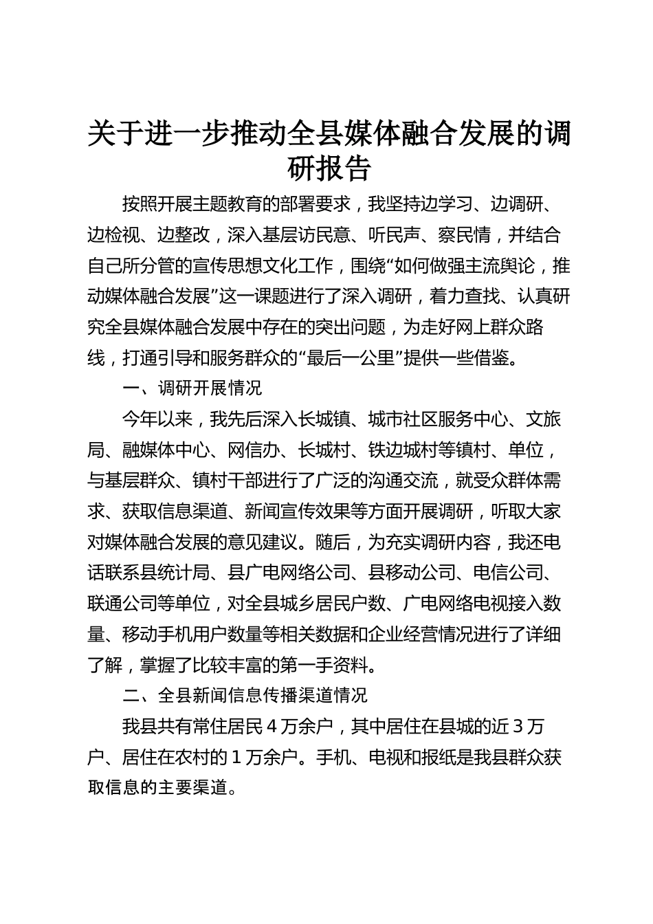 關(guān)于進(jìn)一步推動(dòng)全縣媒體融合發(fā)展的調(diào)研報(bào)告按照開展主題教育的部署要求,我堅(jiān)持邊學(xué)習(xí)、邊調(diào)研、邊檢視、邊整改,深入基層訪民意、聽民聲、察民情,并結(jié)合“自己所分管的宣傳思想文化工作,圍繞如何做強(qiáng)主流輿論,推”動(dòng)媒體融合發(fā)展這一課題進(jìn)行了深入調(diào)研,著力查找、認(rèn)真研究全縣媒體融合發(fā)展中存在的突出問題,為走好網(wǎng)上群眾路“”線,打通引導(dǎo)和服務(wù)群眾的最后一公里提供一些借鑒。一、調(diào)研開展情況今年以來,我先后深入長(zhǎng)城鎮(zhèn)、城市社區(qū)服務(wù)中心、文旅局、融媒體中心、網(wǎng)信辦、長(zhǎng)城村、鐵邊城村等鎮(zhèn)村、單位,與基層群眾、鎮(zhèn)村干部進(jìn)行了廣泛的溝通交流,就受眾群...