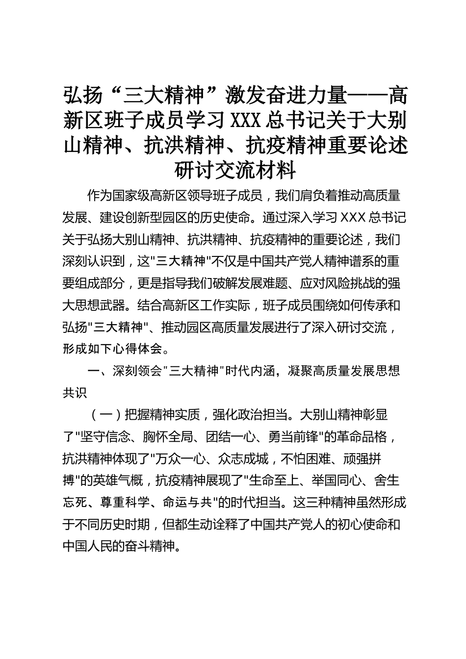 弘揚“三大精神”激發(fā)奮進力量——高新區(qū)班子成員學習XXX總書記關于大別山精神、抗洪精神、抗疫精神重要論述研討交流材料作為國家級高新區(qū)領導班子成員,我們肩負著推動高質量發(fā)展、建設創(chuàng)新型園區(qū)的歷史使命。通過深入學習XXX總書記關于弘揚大別山精神、抗洪精神、抗疫精神的重要論述,我們深刻認識到,這"三大精神"不僅是中國共產(chǎn)黨人精神譜系的重要組成部分,更是指導我們破解發(fā)展難題、應對風險挑戰(zhàn)的強大思想武器。結合高新區(qū)工作實際,班子成員圍繞如何傳承和弘揚"三大精神"、推動園區(qū)高質量發(fā)展進行了深入研討交流,形成如下心得體會。一、深刻領會"三大精神"時代...