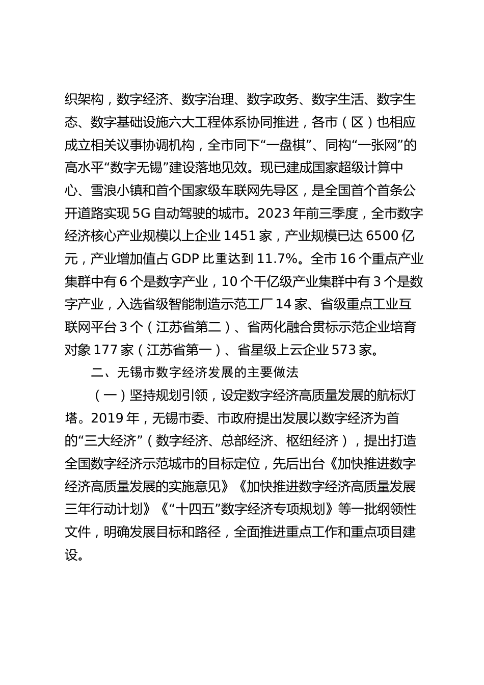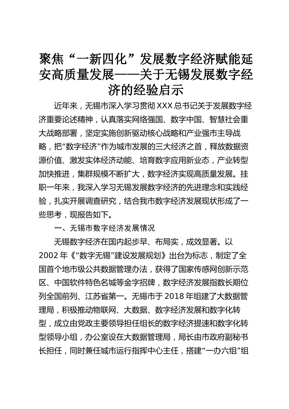 聚焦“一新四化”發(fā)展數(shù)字經(jīng)濟(jì)賦能延安高質(zhì)量發(fā)展——關(guān)于無錫發(fā)展數(shù)字經(jīng)濟(jì)的經(jīng)驗啟示近年來,無錫市深入學(xué)習(xí)貫徹XXX總書記關(guān)于發(fā)展數(shù)字經(jīng)濟(jì)重要論述精神,認(rèn)真落實網(wǎng)絡(luò)強(qiáng)國、數(shù)字中國、智慧社會重大戰(zhàn)略部署,堅定實施創(chuàng)新驅(qū)動核心戰(zhàn)略和產(chǎn)業(yè)強(qiáng)市主導(dǎo)戰(zhàn)“”略,把數(shù)字經(jīng)濟(jì)作為城市發(fā)展的三大經(jīng)濟(jì)之首,釋放數(shù)據(jù)資源價值、激發(fā)實體經(jīng)濟(jì)動能、培育數(shù)字應(yīng)用新業(yè)態(tài),產(chǎn)業(yè)轉(zhuǎn)型加快推進(jìn),集群規(guī)模不斷擴(kuò)大,數(shù)字經(jīng)濟(jì)實現(xiàn)高質(zhì)量發(fā)展。掛職一年來,我深入學(xué)習(xí)無錫發(fā)展數(shù)字經(jīng)濟(jì)的先進(jìn)理念和實踐經(jīng)驗,扎實開展調(diào)查研究,結(jié)合我市數(shù)字經(jīng)濟(jì)發(fā)展現(xiàn)狀形成了一些思考,現(xiàn)報告如下。一...