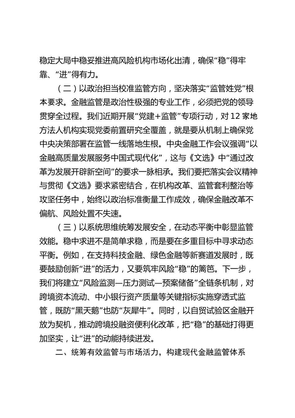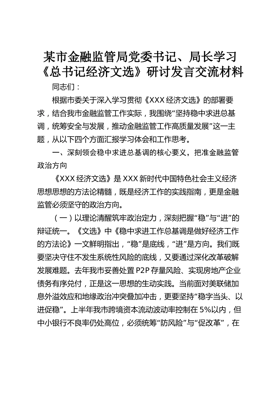 某市金融監(jiān)管局黨委書記、局長學(xué)習(xí)《總書記經(jīng)濟(jì)文選》研討發(fā)言交流材料同志們:根據(jù)市委關(guān)于深入學(xué)習(xí)貫徹《XXX經(jīng)濟(jì)文選》的部署要“求,結(jié)合我市金融監(jiān)管工作實際,我圍繞堅持穩(wěn)中求進(jìn)總基”調(diào),統(tǒng)籌安全與發(fā)展,推動金融監(jiān)管工作高質(zhì)量發(fā)展這一主題,從以下四個方面匯報學(xué)習(xí)體會和工作思考。一、深刻領(lǐng)會穩(wěn)中求進(jìn)總基調(diào)的核心要義,把準(zhǔn)金融監(jiān)管政治方向《XXX經(jīng)濟(jì)文選》是XXX新時代中國特色社會主義經(jīng)濟(jì)思想思想的方法論精髓,既是經(jīng)濟(jì)工作的實踐指南,更是金融監(jiān)管必須堅守的政治方向?!啊薄啊保ㄒ唬┮岳碚撉逍阎握味Γ羁贪盐辗€(wěn)與進(jìn)的辯證統(tǒng)一。《文選》中《...