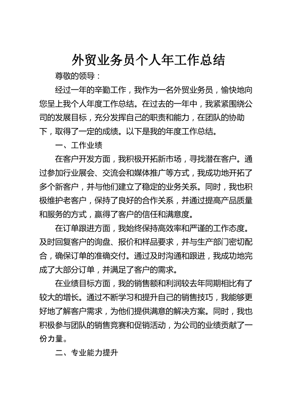 外貿(mào)業(yè)務(wù)員個(gè)人年工作總結(jié)尊敬的領(lǐng)導(dǎo):經(jīng)過(guò)一年的辛勤工作,我作為一名外貿(mào)業(yè)務(wù)員,愉快地向您呈上我個(gè)人年度工作總結(jié)。在過(guò)去的一年中,我緊緊圍繞公司的發(fā)展目標(biāo),充分發(fā)揮自己的職責(zé)和能力,在團(tuán)隊(duì)的協(xié)助下,取得了一定的成績(jī)。以下是我的年度工作總結(jié)。一、工作業(yè)績(jī)?cè)诳蛻糸_(kāi)發(fā)方面,我積極開(kāi)拓新市場(chǎng),尋找潛在客戶。通過(guò)參加行業(yè)展會(huì)、交流會(huì)和媒體推廣等方式,我成功地開(kāi)拓了多個(gè)新客戶,并與他們建立了穩(wěn)定的業(yè)務(wù)關(guān)系。同時(shí),我也積極維護(hù)老客戶,保持了良好的合作關(guān)系,并通過(guò)提高產(chǎn)品質(zhì)量和服務(wù)的方式,贏得了客戶的信任和滿意度。在訂單跟進(jìn)方面,我始終保持高...
