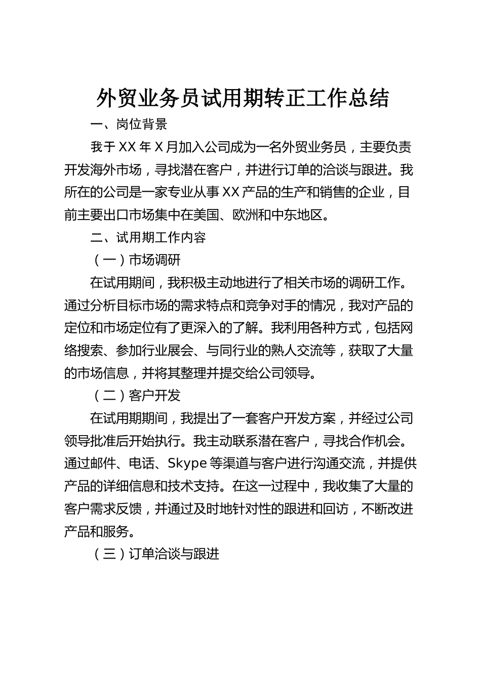 外貿業(yè)務員試用期轉正工作總結一、崗位背景我于XX年X月加入公司成為一名外貿業(yè)務員,主要負責開發(fā)海外市場,尋找潛在客戶,并進行訂單的洽談與跟進。我所在的公司是一家專業(yè)從事XX產(chǎn)品的生產(chǎn)和銷售的企業(yè),目前主要出口市場集中在美國、歐洲和中東地區(qū)。二、試用期工作內容(一)市場調研在試用期間,我積極主動地進行了相關市場的調研工作。通過分析目標市場的需求特點和競爭對手的情況,我對產(chǎn)品的定位和市場定位有了更深入的了解。我利用各種方式,包括網(wǎng)絡搜索、參加行業(yè)展會、與同行業(yè)的熟人交流等,獲取了大量的市場信息,并將其整理并提交給公司領導。(二)客戶...