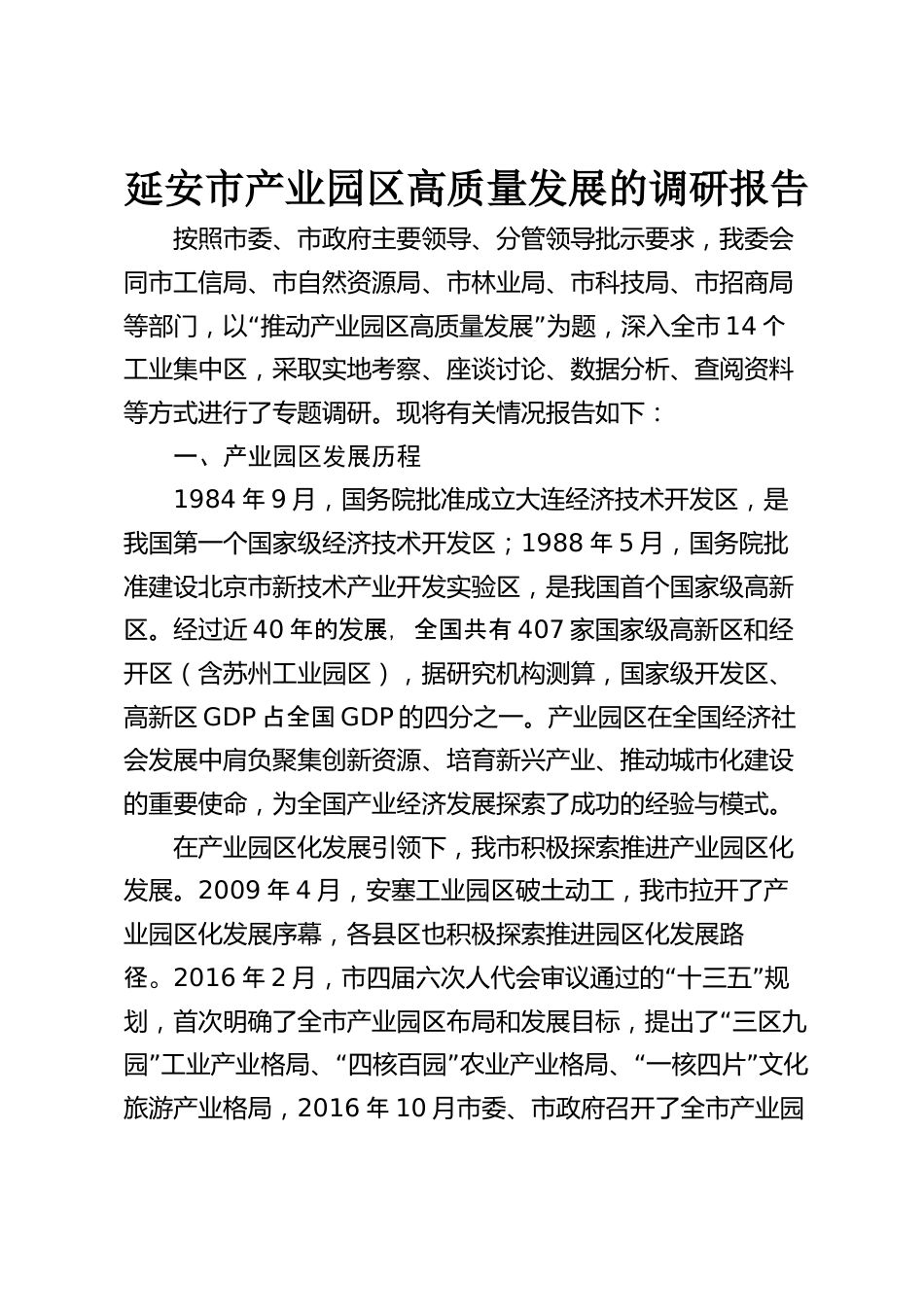 延安市產業(yè)園區(qū)高質量發(fā)展的調研報告按照市委、市政府主要領導、分管領導批示要求,我委會同市工信局、市自然資源局、市林業(yè)局、市科技局、市招商局“”等部門,以推動產業(yè)園區(qū)高質量發(fā)展為題,深入全市14個工業(yè)集中區(qū),采取實地考察、座談討論、數(shù)據(jù)分析、查閱資料等方式進行了專題調研?,F(xiàn)將有關情況報告如下:一、產業(yè)園區(qū)發(fā)展歷程1984年9月,國務院批準成立大連經濟技術開發(fā)區(qū),是我國第一個國家級經濟技術開發(fā)區(qū);1988年5月,國務院批準建設北京市新技術產業(yè)開發(fā)實驗區(qū),是我國首個國家級高新區(qū)。經過近40年的發(fā)展,全國共有407家國家級高新區(qū)和經開區(qū)(含蘇州工業(yè)...