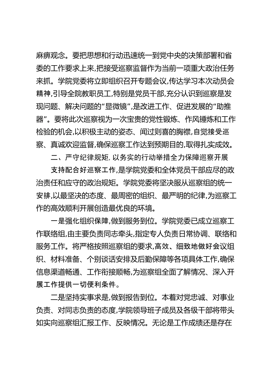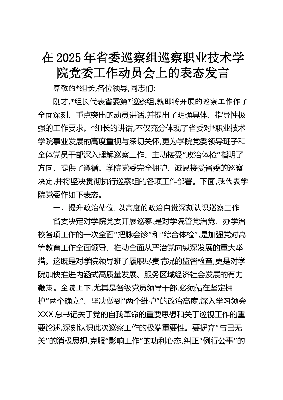 在2025年省委巡察組巡察職業(yè)技術(shù)學(xué)院黨委工作動(dòng)員會(huì)上的表態(tài)發(fā)言尊敬的*組長(zhǎng),各位領(lǐng)導(dǎo),同志們:剛才,*組長(zhǎng)代表省委第*巡察組,就即將開展的巡察工作作了全面深刻、重點(diǎn)突出的動(dòng)員講話,并提出了明確具體、指導(dǎo)性極強(qiáng)的工作要求。*組長(zhǎng)的講話,不僅充分體現(xiàn)了省委對(duì)*職業(yè)技術(shù)學(xué)院事業(yè)發(fā)展的高度重視與深切關(guān)懷,更為學(xué)院黨委領(lǐng)導(dǎo)班子和“”全體黨員干部深入理解巡察工作、主動(dòng)接受政治體檢指明了方向、提供了遵循。學(xué)院黨委完全擁護(hù)、誠(chéng)懇接受省委的巡察決定,并將堅(jiān)決貫徹執(zhí)行巡察組的各項(xiàng)工作部署。下面,我代表學(xué)院黨委作如下表態(tài)。一、提升政治站位,以高度的政治自覺深刻認(rèn)識(shí)...