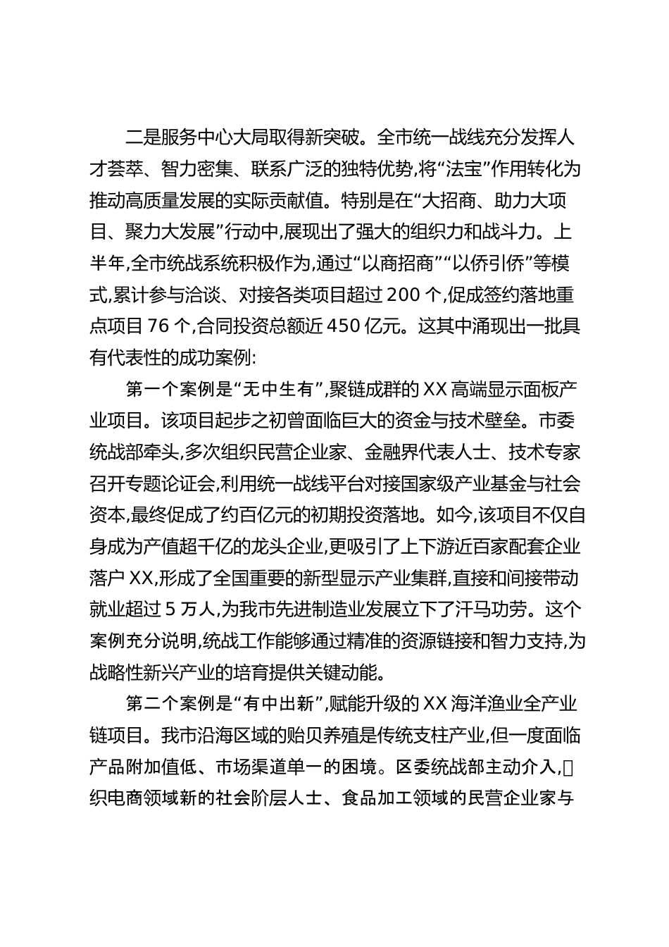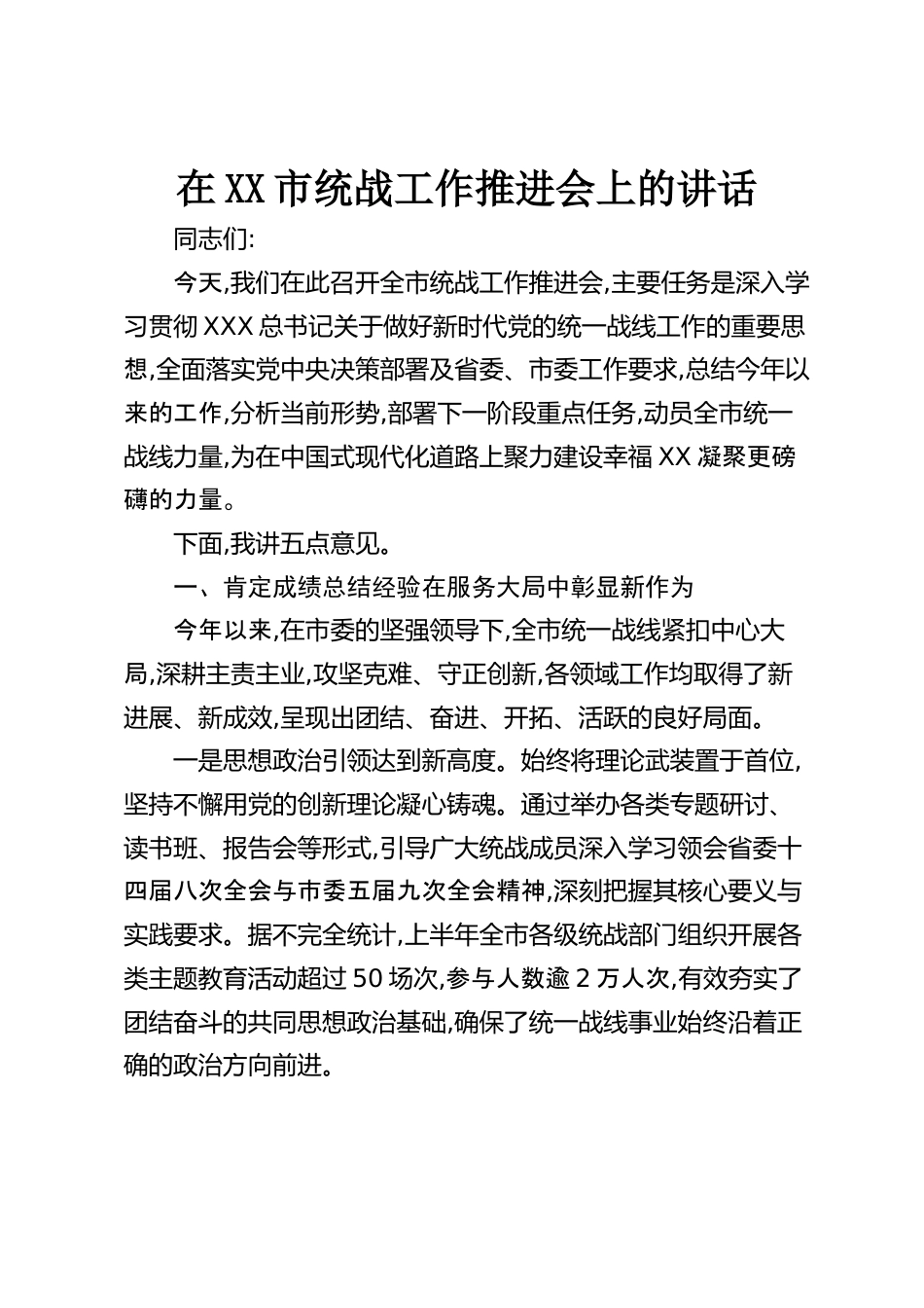 在XX市統(tǒng)戰(zhàn)工作推進(jìn)會(huì)上的講話同志們:今天,我們?cè)诖苏匍_(kāi)全市統(tǒng)戰(zhàn)工作推進(jìn)會(huì),主要任務(wù)是深入學(xué)習(xí)貫徹XXX總書(shū)記關(guān)于做好新時(shí)代黨的統(tǒng)一戰(zhàn)線工作的重要思想,全面落實(shí)黨中央決策部署及省委、市委工作要求,總結(jié)今年以來(lái)的工作,分析當(dāng)前形勢(shì),部署下一階段重點(diǎn)任務(wù),動(dòng)員全市統(tǒng)一戰(zhàn)線力量,為在中國(guó)式現(xiàn)代化道路上聚力建設(shè)幸福XX凝聚更磅礴的力量。下面,我講五點(diǎn)意見(jiàn)。一、肯定成績(jī)總結(jié)經(jīng)驗(yàn)在服務(wù)大局中彰顯新作為今年以來(lái),在市委的堅(jiān)強(qiáng)領(lǐng)導(dǎo)下,全市統(tǒng)一戰(zhàn)線緊扣中心大局,深耕主責(zé)主業(yè),攻堅(jiān)克難、守正創(chuàng)新,各領(lǐng)域工作均取得了新進(jìn)展、新成效,呈現(xiàn)出團(tuán)結(jié)、奮進(jìn)、開(kāi)拓、活躍的良好局...