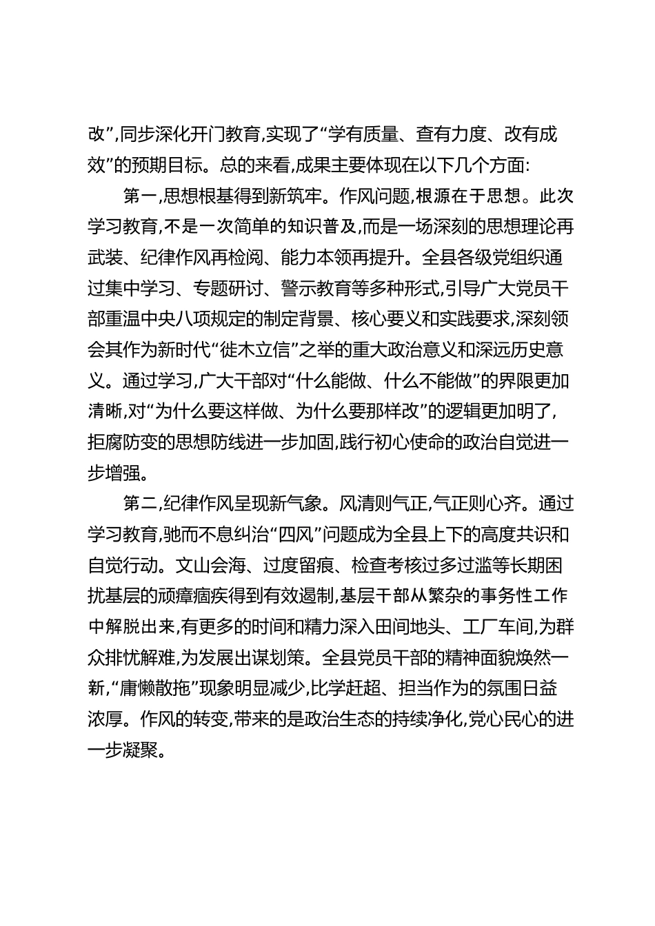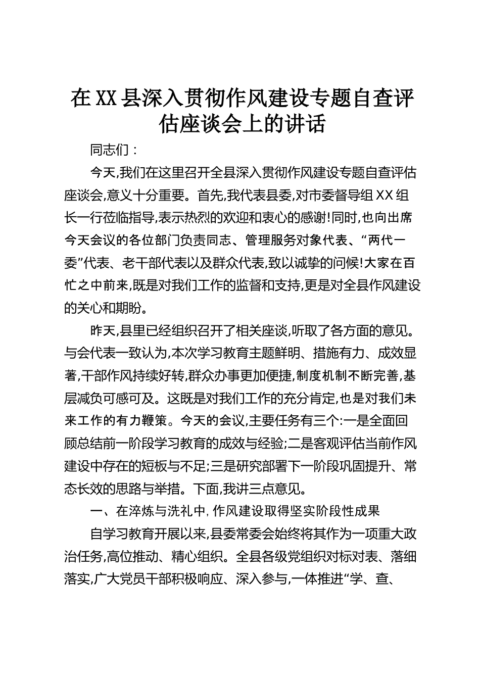 在XX縣深入貫徹作風(fēng)建設(shè)專題自查評估座談會上的講話同志們:今天,我們在這里召開全縣深入貫徹作風(fēng)建設(shè)專題自查評估座談會,意義十分重要。首先,我代表縣委,對市委督導(dǎo)組XX組長一行蒞臨指導(dǎo),表示熱烈的歡迎和衷心的感謝!同時,也向出席“今天會的各位部同志、管理服象代表、兩代一議門負責務(wù)對”委代表、老干部代表以及群眾代表,致以誠摯的問候!大家在百忙之中前來,既是對我們工作的監(jiān)督和支持,更是對全縣作風(fēng)建設(shè)的關(guān)心和期盼。昨天,縣里已經(jīng)組織召開了相關(guān)座談,聽取了各方面的意見。與會代表一致認為,本次學(xué)習(xí)教育主題鮮明、措施有力、成效顯著,干部作風(fēng)持續(xù)好轉(zhuǎn),群眾辦事...