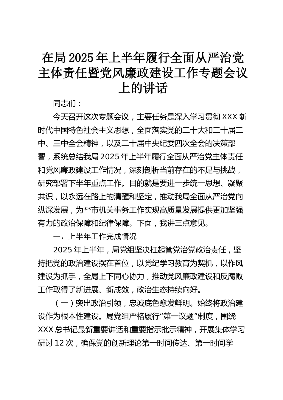 在局2025年上半年履行全面從嚴(yán)治黨主體責(zé)任暨黨風(fēng)廉政建設(shè)工作專(zhuān)題會(huì)議上的講話VIP免費(fèi)