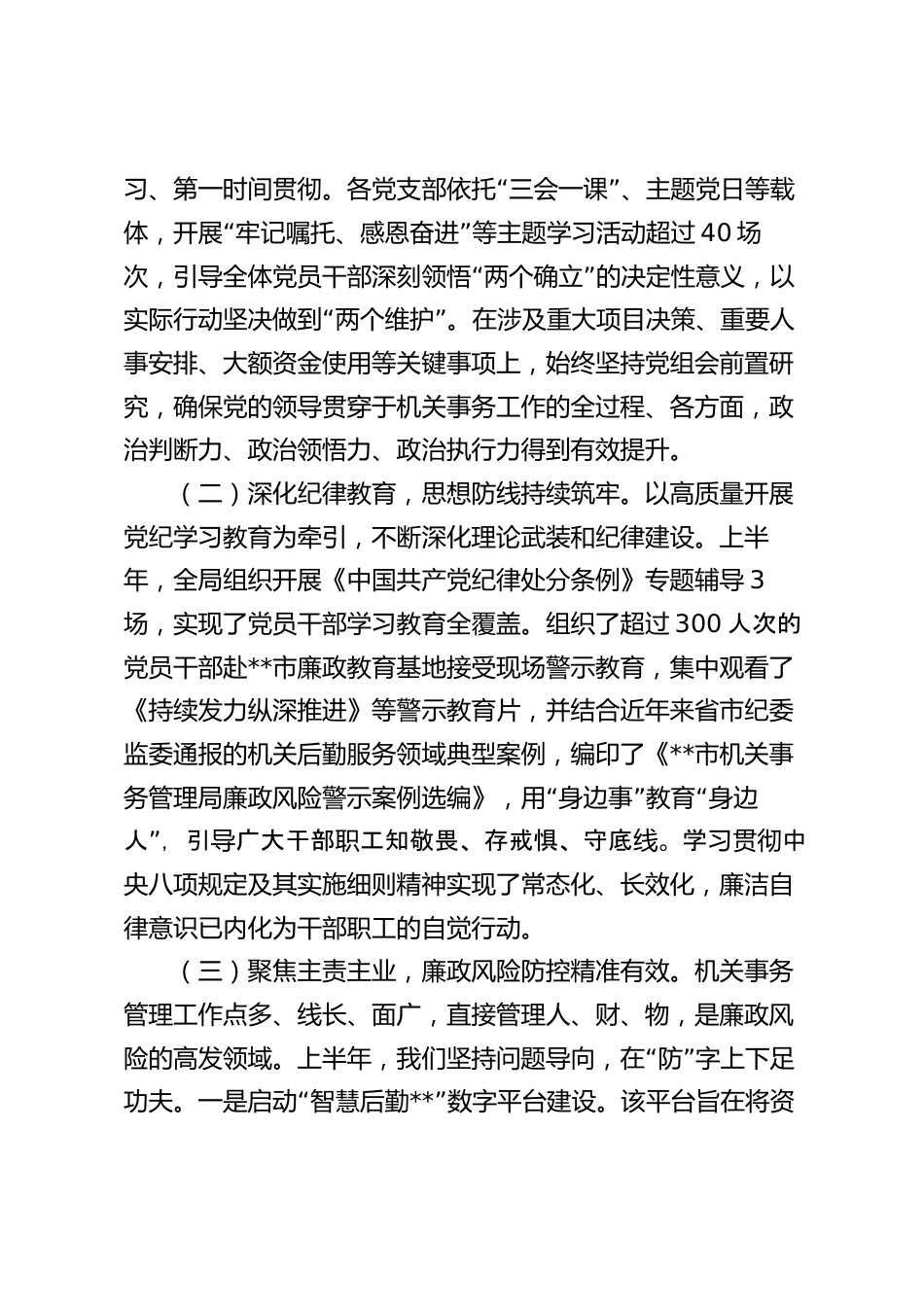 在局2025年上半年履行全面從嚴(yán)治黨主體責(zé)任暨黨風(fēng)廉政建設(shè)工作專(zhuān)題會(huì)議上的講話同志們:今天召開(kāi)這次專(zhuān)題會(huì)議,主要任務(wù)是深入學(xué)習(xí)貫徹XXX新時(shí)代中國(guó)特色社會(huì)主義思想,全面落實(shí)黨的二十大和二十屆二中、三中全會(huì)精神,以及二十屆中央紀(jì)委四次全會(huì)的決策部署,系統(tǒng)總結(jié)我局2025年上半年履行全面從嚴(yán)治黨主體責(zé)任和黨風(fēng)廉政建設(shè)工作情況,深刻剖析當(dāng)前存在的不足與挑戰(zhàn),研究部署下半年重點(diǎn)工作。目的就是要進(jìn)一步統(tǒng)一思想、凝聚共識(shí),以永遠(yuǎn)在路上的清醒和堅(jiān)定,推動(dòng)我局全面從嚴(yán)治黨向縱深發(fā)展,為**市機(jī)關(guān)事務(wù)工作實(shí)現(xiàn)高質(zhì)量發(fā)展提供更加堅(jiān)強(qiáng)有力的政治保障和紀(jì)律保障...