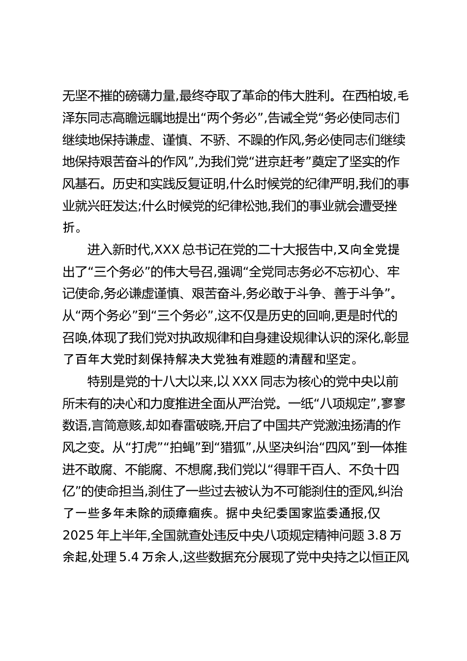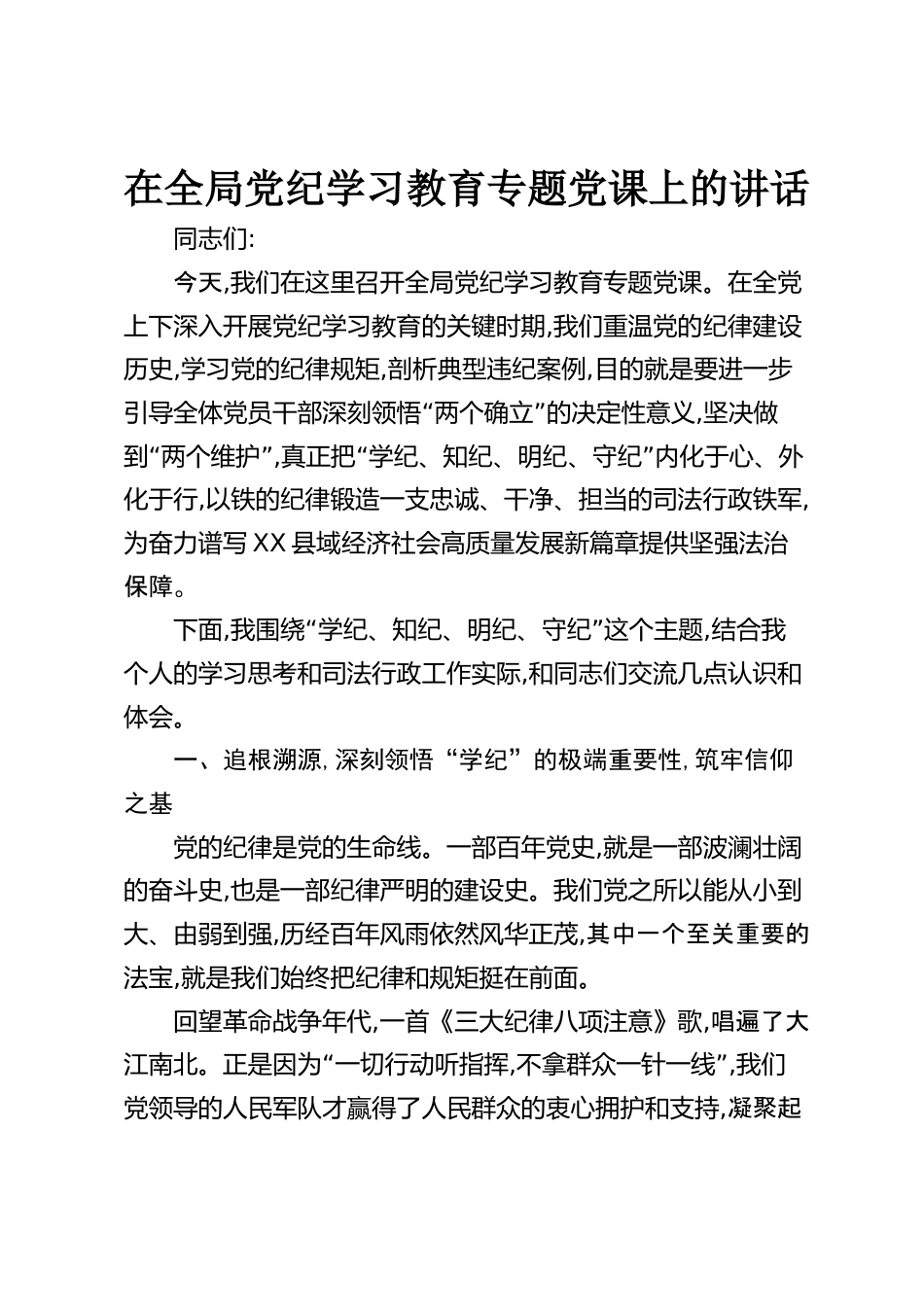 在全局黨紀學習教育專題黨課上的講話同志們:今天,我們在這里召開全局黨紀學習教育專題黨課。在全黨上下深入開展黨紀學習教育的關鍵時期,我們重溫黨的紀律建設歷史,學習黨的紀律規(guī)矩,剖析典型違紀案例,目的就是要進一步“”引導全體黨員干部深刻領悟兩個確立的決定性意義,堅決做“”到兩個維護,“”真正把學紀、知紀、明紀、守紀內(nèi)化于心、外化于行,以鐵的紀律鍛造一支忠誠、干凈、擔當?shù)乃痉ㄐ姓F軍,為奮力譜寫XX縣域經(jīng)濟社會高質(zhì)量發(fā)展新篇章提供堅強法治保障。下面,“”我圍繞學紀、知紀、明紀、守紀這個主題,結合我個人的學習思考和司法行政工作實際,和同志們交流幾...