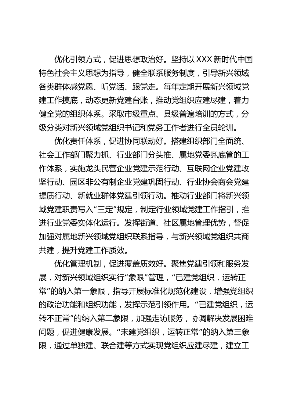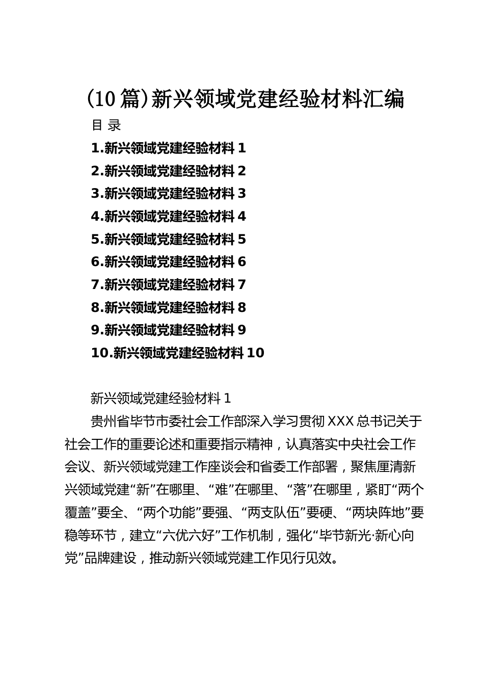 (10篇)新興領(lǐng)域黨建經(jīng)驗(yàn)材料匯編目錄1.新興領(lǐng)域黨建經(jīng)驗(yàn)材料12.新興領(lǐng)域黨建經(jīng)驗(yàn)材料23.新興領(lǐng)域黨建經(jīng)驗(yàn)材料34.新興領(lǐng)域黨建經(jīng)驗(yàn)材料45.新興領(lǐng)域黨建經(jīng)驗(yàn)材料56.新興領(lǐng)域黨建經(jīng)驗(yàn)材料67.新興領(lǐng)域黨建經(jīng)驗(yàn)材料78.新興領(lǐng)域黨建經(jīng)驗(yàn)材料89.新興領(lǐng)域黨建經(jīng)驗(yàn)材料910.新興領(lǐng)域黨建經(jīng)驗(yàn)材料10新興領(lǐng)域黨建經(jīng)驗(yàn)材料1貴州省畢節(jié)市委社會(huì)工作部深入學(xué)習(xí)貫徹XXX總書記關(guān)于社會(huì)工作的重要論述和重要指示精神,認(rèn)真落實(shí)中央社會(huì)工作會(huì)議、新興領(lǐng)域黨建工作座談會(huì)和省委工作部署,聚焦厘清新“”“”“”“興領(lǐng)域黨建新在哪里、難在哪里、落在哪里,緊盯兩個(gè)”“”“”“”覆蓋要全、...