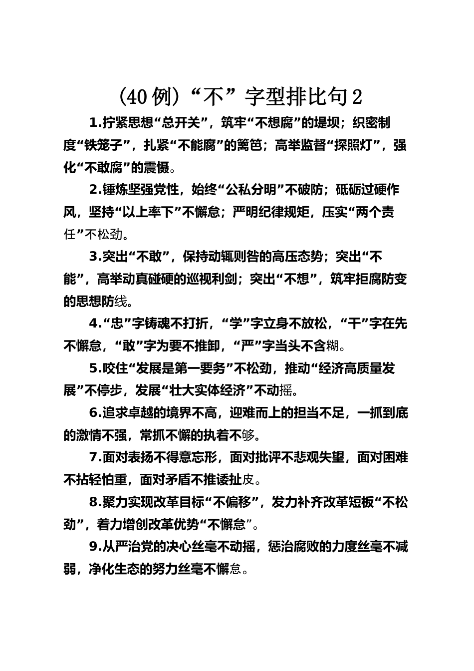 (40例)“不”字型排比句21.“”“”擰緊思想總開(kāi)關(guān),筑牢不想腐的堤壩;織密制“”“”“”度鐵籠子,扎緊不能腐的籬笆;高舉監(jiān)督探照燈,強(qiáng)“”化不敢腐的震懾。2.“”錘煉堅(jiān)強(qiáng)黨性,始終公私分明不破防;砥礪過(guò)硬作“”“風(fēng),堅(jiān)持以上率下不懈??;嚴(yán)明紀(jì)律規(guī)矩,壓實(shí)兩個(gè)責(zé)”任不松勁。3.“”“突出不敢,保持動(dòng)輒則咎的高壓態(tài)勢(shì);突出不”“”能,高舉動(dòng)真碰硬的巡視利劍;突出不想,筑牢拒腐防變的思想防線。4.“”“”“”忠字鑄魂不打折,學(xué)字立身不放松,干字在先“”“”不懈怠,敢字為要不推卸,嚴(yán)字當(dāng)頭不含糊。5.“”“咬住發(fā)展是第一要?jiǎng)?wù)不松勁,推動(dòng)經(jīng)濟(jì)高...