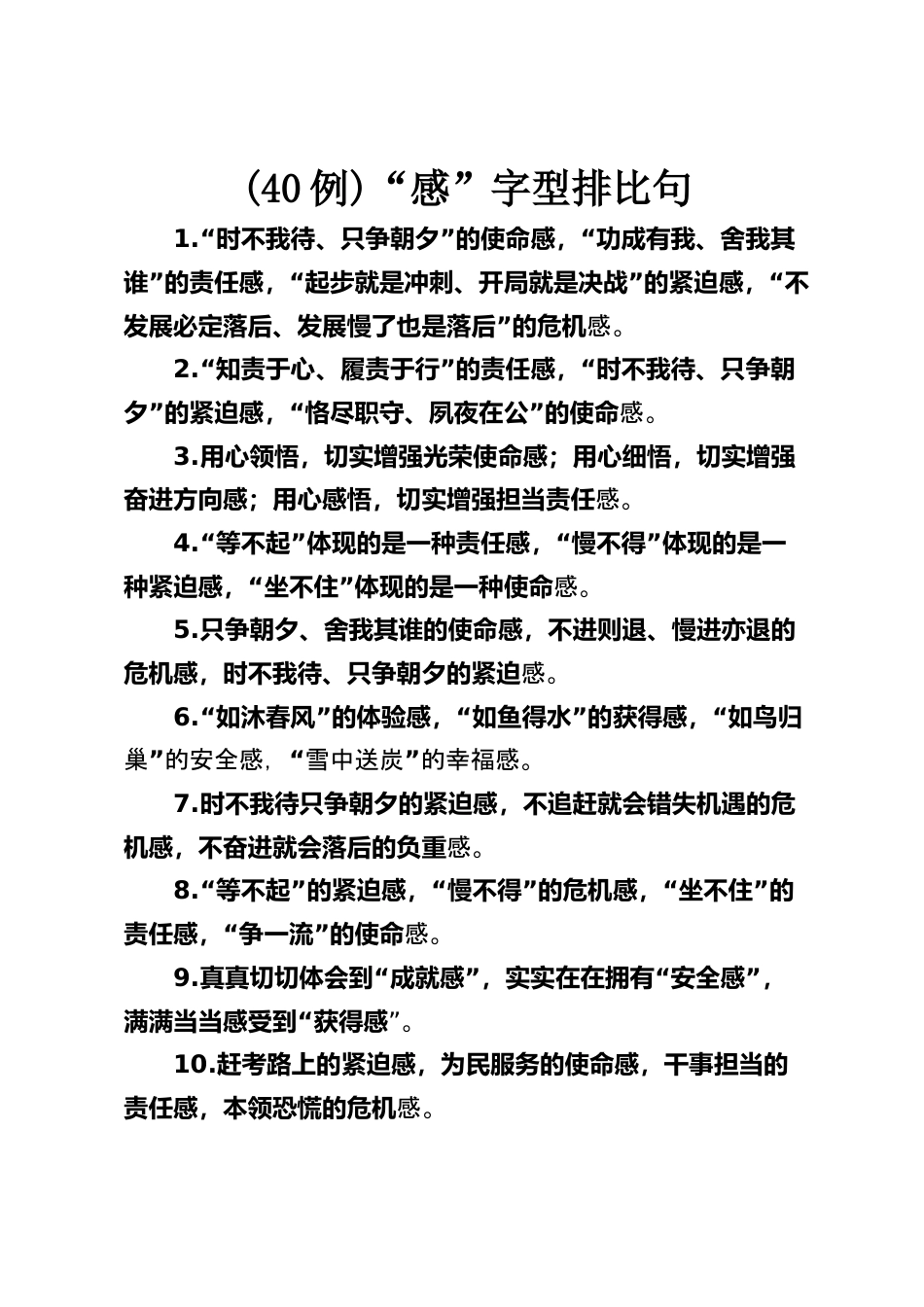 (40例)“感”字型排比句1.“”“時不我待、只爭朝夕的使命感,功成有我、舍我其”“”“誰的責任感,起步就是沖刺、開局就是決戰(zhàn)的緊迫感,不”發(fā)展必定落后、發(fā)展慢了也是落后的危機感。2.“”“知責于心、履責于行的責任感,時不我待、只爭朝”“”夕的緊迫感,恪盡職守、夙夜在公的使命感。3.用心領(lǐng)悟,切實增強光榮使命感;用心細悟,切實增強奮進方向感;用心感悟,切實增強擔當責任感。4.“”“”等不起體現(xiàn)的是一種責任感,慢不得體現(xiàn)的是一“”種緊迫感,坐不住體現(xiàn)的是一種使命感。5.只爭朝夕、舍我其誰的使命感,不進則退、慢進亦退的危機感,時不我待、只爭朝...