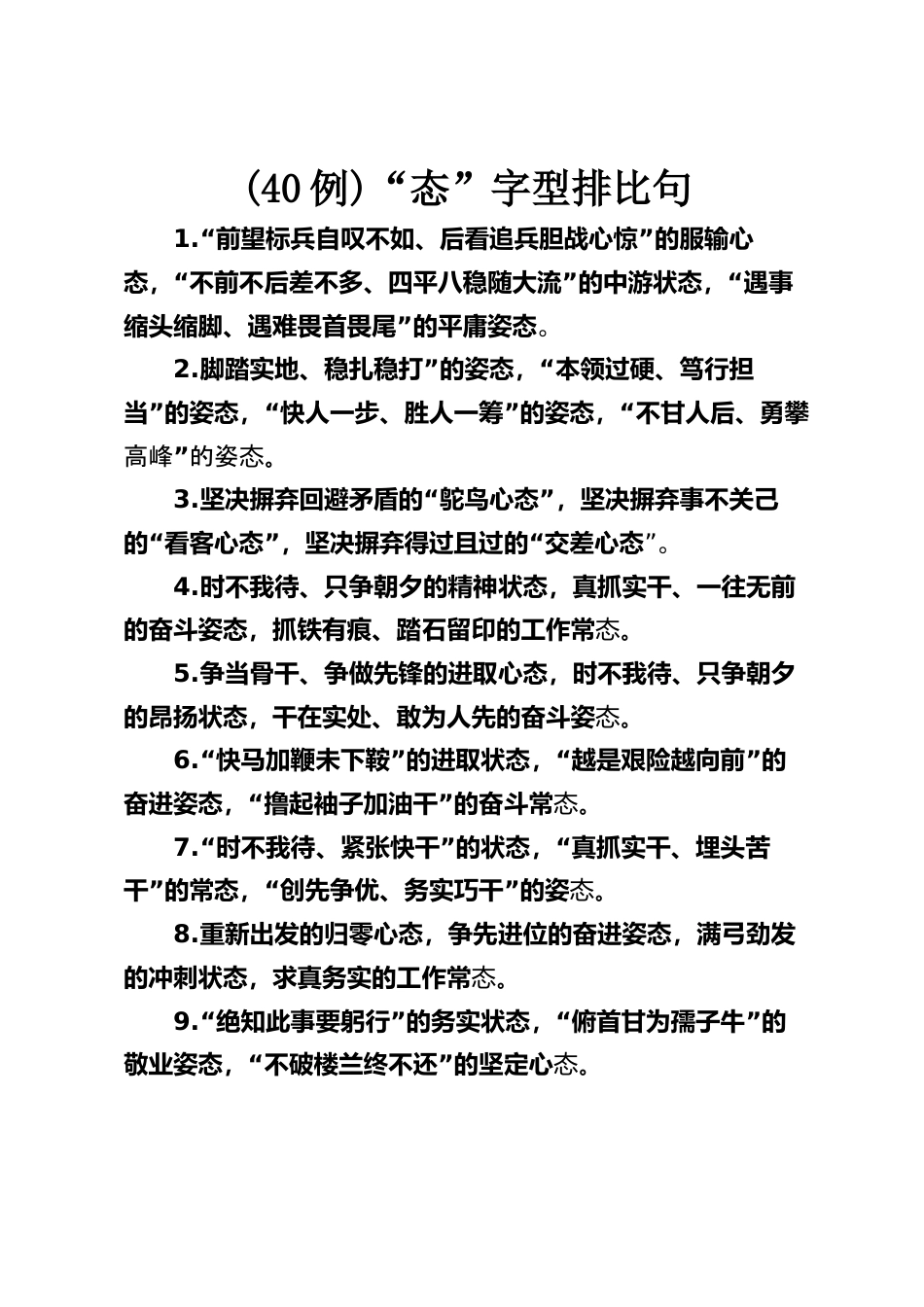 (40例)“態(tài)”字型排比句1.“”前望標(biāo)兵自嘆不如、后看追兵膽戰(zhàn)心驚的服輸心“”“態(tài),不前不后差不多、四平八穩(wěn)隨大流的中游狀態(tài),遇事”縮頭縮腳、遇難畏首畏尾的平庸姿態(tài)。2.”“腳踏實(shí)地、穩(wěn)扎穩(wěn)打的姿態(tài),本領(lǐng)過硬、篤行擔(dān)”“”“當(dāng)?shù)淖藨B(tài),快人一步、勝人一籌的姿態(tài),不甘人后、勇攀”高峰的姿態(tài)。3.“”堅(jiān)決摒棄回避矛盾的鴕鳥心態(tài),堅(jiān)決摒棄事不關(guān)己“”“的看客心態(tài),堅(jiān)決摒棄得過且過的交差心態(tài)”。4.時(shí)不我待、只爭(zhēng)朝夕的精神狀態(tài),真抓實(shí)干、一往無前的奮斗姿態(tài),抓鐵有痕、踏石留印的工作常態(tài)。5.爭(zhēng)當(dāng)骨干、爭(zhēng)做先鋒的進(jìn)取心態(tài),時(shí)不我待、只爭(zhēng)朝夕的昂揚(yáng)狀...
