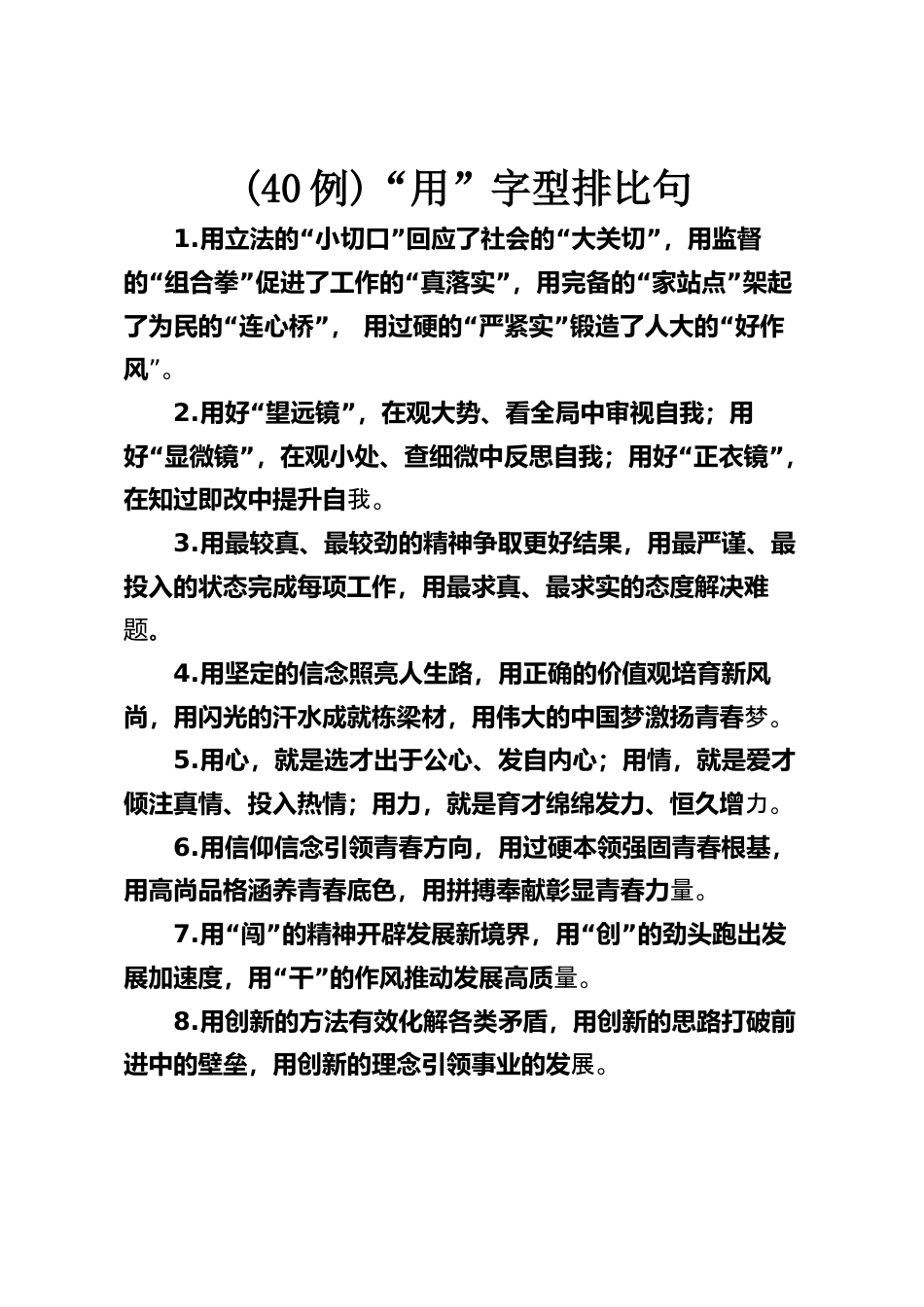 (40例)“用”字型排比句1.“”“”用立法的小切口回應(yīng)了社會(huì)的大關(guān)切,用監(jiān)督“”“”“”的組合拳促進(jìn)了工作的真落實(shí),用完備的家站點(diǎn)架起“”了為民的連心橋,“”“用過(guò)硬的嚴(yán)緊實(shí)鍛造了人大的好作風(fēng)”。2.“”用好望遠(yuǎn)鏡,在觀大勢(shì)、看全局中審視自我;用“”“”好顯微鏡,在觀小處、查細(xì)微中反思自我;用好正衣鏡,在知過(guò)即改中提升自我。3.用最較真、最較勁的精神爭(zhēng)取更好結(jié)果,用最嚴(yán)謹(jǐn)、最投入的狀態(tài)完成每項(xiàng)工作,用最求真、最求實(shí)的態(tài)度解決難題。4.用堅(jiān)定的信念照亮人生路,用正確的價(jià)值觀培育新風(fēng)尚,用閃光的汗水成就棟梁材,用偉大的中國(guó)夢(mèng)激揚(yáng)青春夢(mèng)。5....