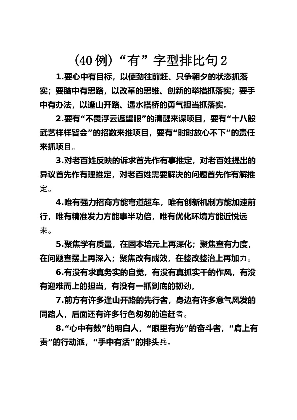 (40例)“有”字型排比句21.要心中有目標,以使勁往前趕、只爭朝夕的狀態(tài)抓落實;要腦中有思路,以改革的思維、創(chuàng)新的舉措抓落實;要手中有辦法,以逢山開路、遇水搭橋的勇氣擔當抓落實。2.“”“要有不畏浮云遮望眼的清醒來謀項目,要有十八般”“”武藝樣樣皆會的招數(shù)來推項目,要有時時放心不下的責任來抓項目。3.對老百姓反映的訴求首先作有事推定,對老百姓提出的異議首先作有理推定,對老百姓需要解決的問題首先作有解推定。4.唯有強力招商方能彎道超車,唯有創(chuàng)新機制方能加速前行,唯有精準發(fā)力方能事半功倍,唯有優(yōu)化環(huán)境方能近悅遠來。5.聚焦學有質(zhì)量,在固本培...