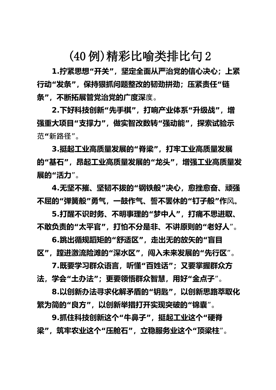 (40例)精彩比喻類排比句21.“”擰緊思想開關(guān),堅定全面從嚴治黨的信心決心;上緊“”“行動發(fā)條,保持狠抓問題整改的韌勁拼勁;壓緊責任鏈”條,不斷拓展管黨治黨的廣度深度。2.“”“”下好科技創(chuàng)新先手棋,打響產(chǎn)業(yè)體系升級戰(zhàn),增“”“”強重大項目支撐力,做實智改數(shù)轉(zhuǎn)強動能,探索試驗示“范新路徑”。3.“”挺起工業(yè)高質(zhì)量發(fā)展的脊梁,打牢工業(yè)高質(zhì)量發(fā)展“”“”的基石,昂起工業(yè)高質(zhì)量發(fā)展的龍頭,增強工業(yè)高質(zhì)量發(fā)“展的活力”。4.“”無堅不摧、堅韌不拔的鋼鐵般決心,愈挫愈奮、頑強“”“”不屈的彈簧般勇氣,一鼓作氣、誓不罷休的釘子般作風。5.“”打醒不...