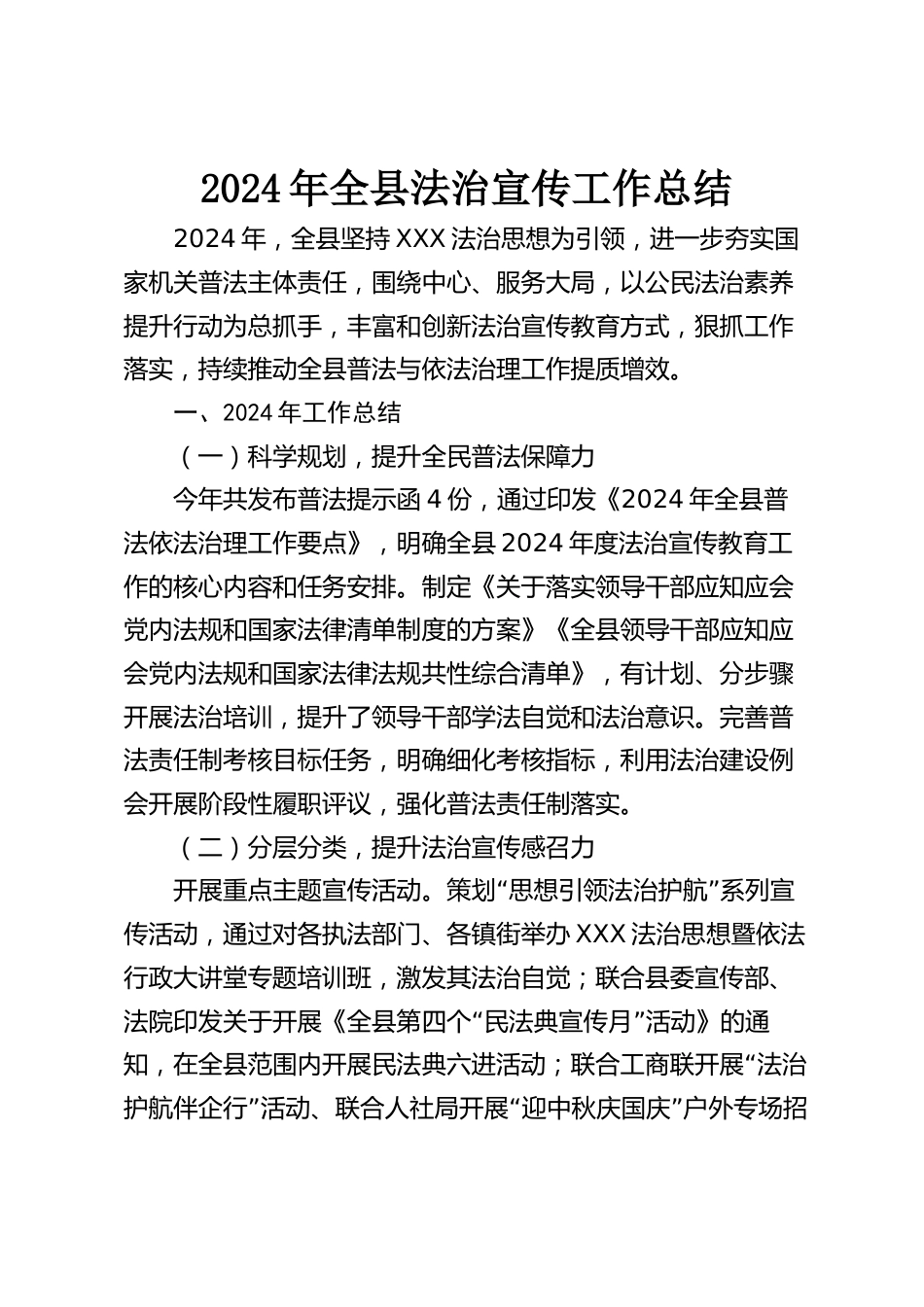 2024年全縣法治宣傳工作總結(jié)2024年,全縣堅(jiān)持XXX法治思想為引領(lǐng),進(jìn)一步夯實(shí)國(guó)家機(jī)關(guān)普法主體責(zé)任,圍繞中心、服務(wù)大局,以公民法治素養(yǎng)提升行動(dòng)為總抓手,豐富和創(chuàng)新法治宣傳教育方式,狠抓工作落實(shí),持續(xù)推動(dòng)全縣普法與依法治理工作提質(zhì)增效。一、2024年工作總結(jié)(一)科學(xué)規(guī)劃,提升全民普法保障力今年共發(fā)布普法提示函4份,通過印發(fā)《2024年全縣普法依法治理工作要點(diǎn)》,明確全縣2024年度法治宣傳教育工作的核心內(nèi)容和任務(wù)安排。制定《關(guān)于落實(shí)領(lǐng)導(dǎo)干部應(yīng)知應(yīng)會(huì)黨內(nèi)法規(guī)和國(guó)家法律清單制度的方案》《全縣領(lǐng)導(dǎo)干部應(yīng)知應(yīng)會(huì)黨內(nèi)法規(guī)和國(guó)家法律法規(guī)共性綜合清單》,有計(jì)...