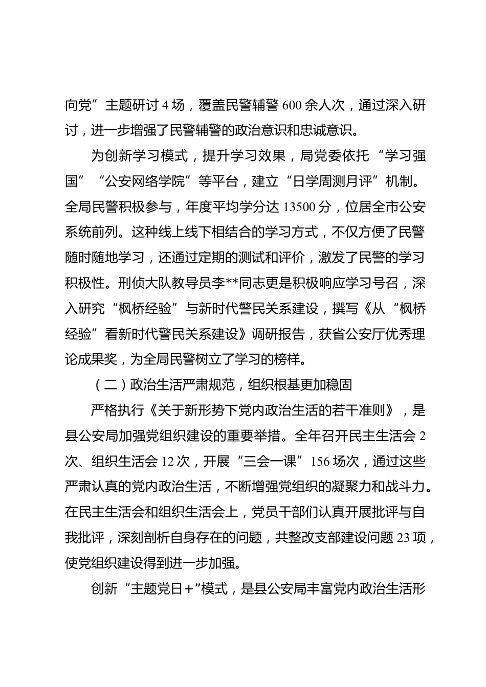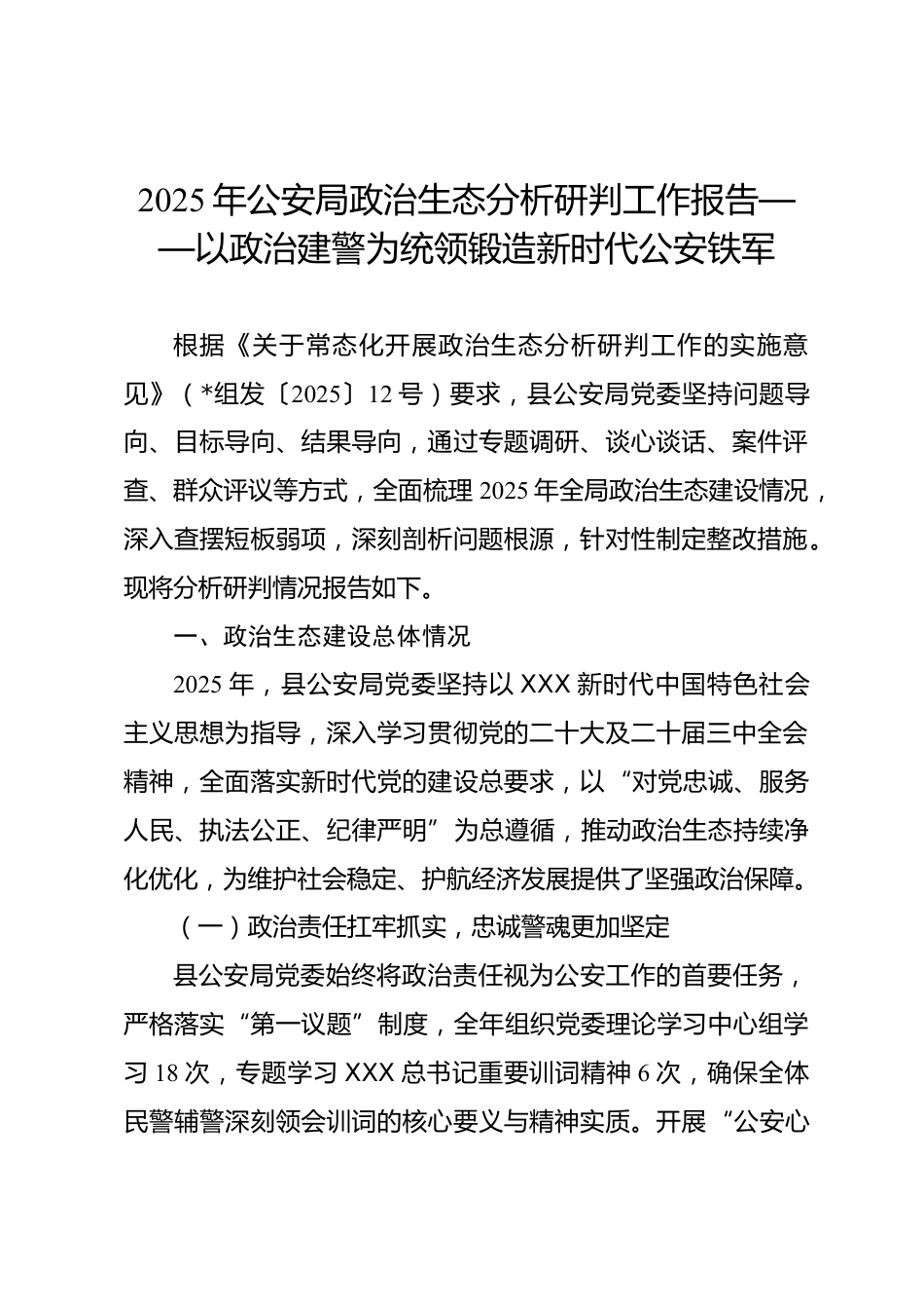 2025年公安局政治生態(tài)分析研判工作報告——以政治建警為統(tǒng)領(lǐng)鍛造新時代公安鐵軍根據(jù)《關(guān)于常態(tài)化開展政治生態(tài)分析研判工作的實施意見》(*組發(fā)〔2025〕12號)要求,縣公安局黨委堅持問題導(dǎo)向、目標(biāo)導(dǎo)向、結(jié)果導(dǎo)向,通過專題調(diào)研、談心談話、案件評查、群眾評議等方式,全面梳理2025年全局政治生態(tài)建設(shè)情況,深入查擺短板弱項,深刻剖析問題根源,針對性制定整改措施?,F(xiàn)將分析研判情況報告如下。一、政治生態(tài)建設(shè)總體情況2025年,縣公安局黨委堅持以XXX新時代中國特色社會主義思想為指導(dǎo),深入學(xué)習(xí)貫徹黨的二十大及二十屆三中全會精神,全面落實新時代黨的建設(shè)總要求,以...