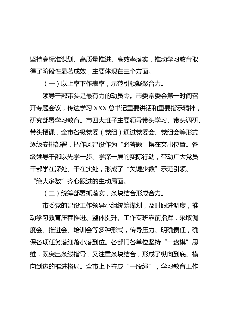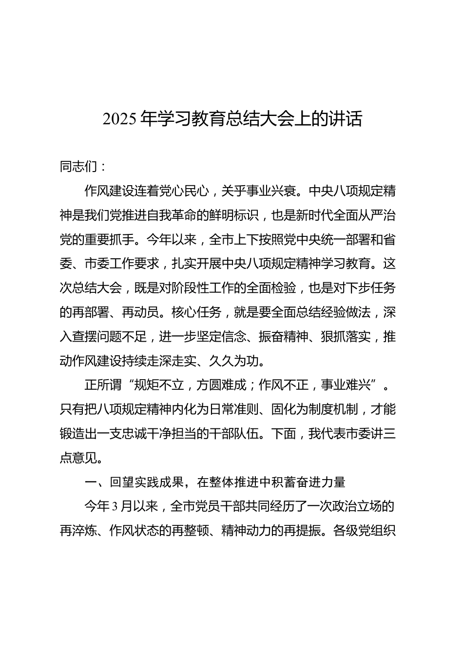 2025年學(xué)習(xí)教育總結(jié)大會(huì)上的講話同志們:作風(fēng)建設(shè)連著黨心民心,關(guān)乎事業(yè)興衰。中央八項(xiàng)規(guī)定精神是我們黨推進(jìn)自我革命的鮮明標(biāo)識(shí),也是新時(shí)代全面從嚴(yán)治黨的重要抓手。今年以來,全市上下按照黨中央統(tǒng)一部署和省委、市委工作要求,扎實(shí)開展中央八項(xiàng)規(guī)定精神學(xué)習(xí)教育。這次總結(jié)大會(huì),既是對(duì)階段性工作的全面檢驗(yàn),也是對(duì)下步任務(wù)的再部署、再動(dòng)員。核心任務(wù),就是要全面總結(jié)經(jīng)驗(yàn)做法,深入查擺問題不足,進(jìn)一步堅(jiān)定信念、振奮精神、狠抓落實(shí),推動(dòng)作風(fēng)建設(shè)持續(xù)走深走實(shí)、久久為功。正所謂“規(guī)矩不立,方圓難成;作風(fēng)不正,事業(yè)難興”。只有把八項(xiàng)規(guī)定精神內(nèi)化為日常準(zhǔn)則、...
