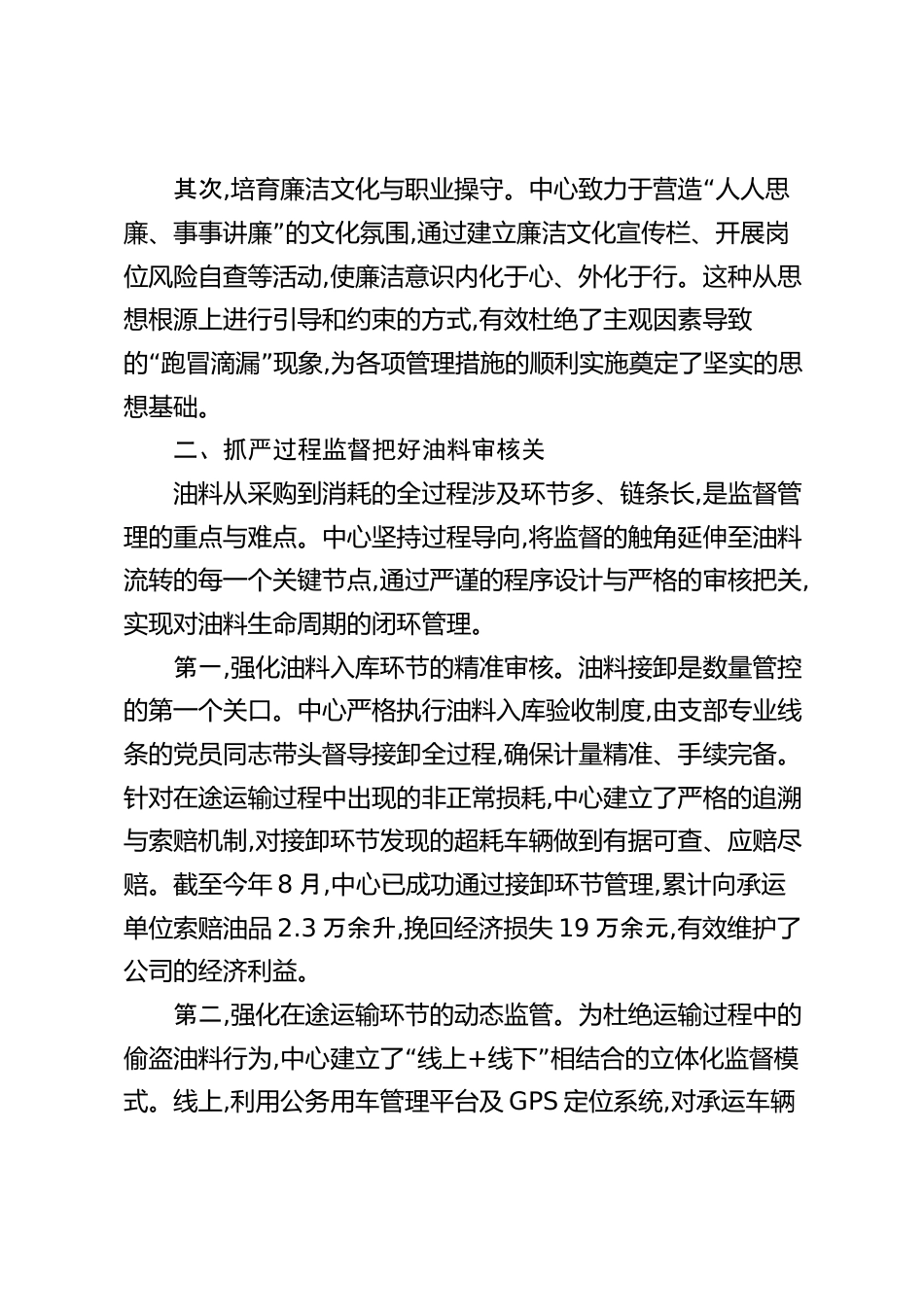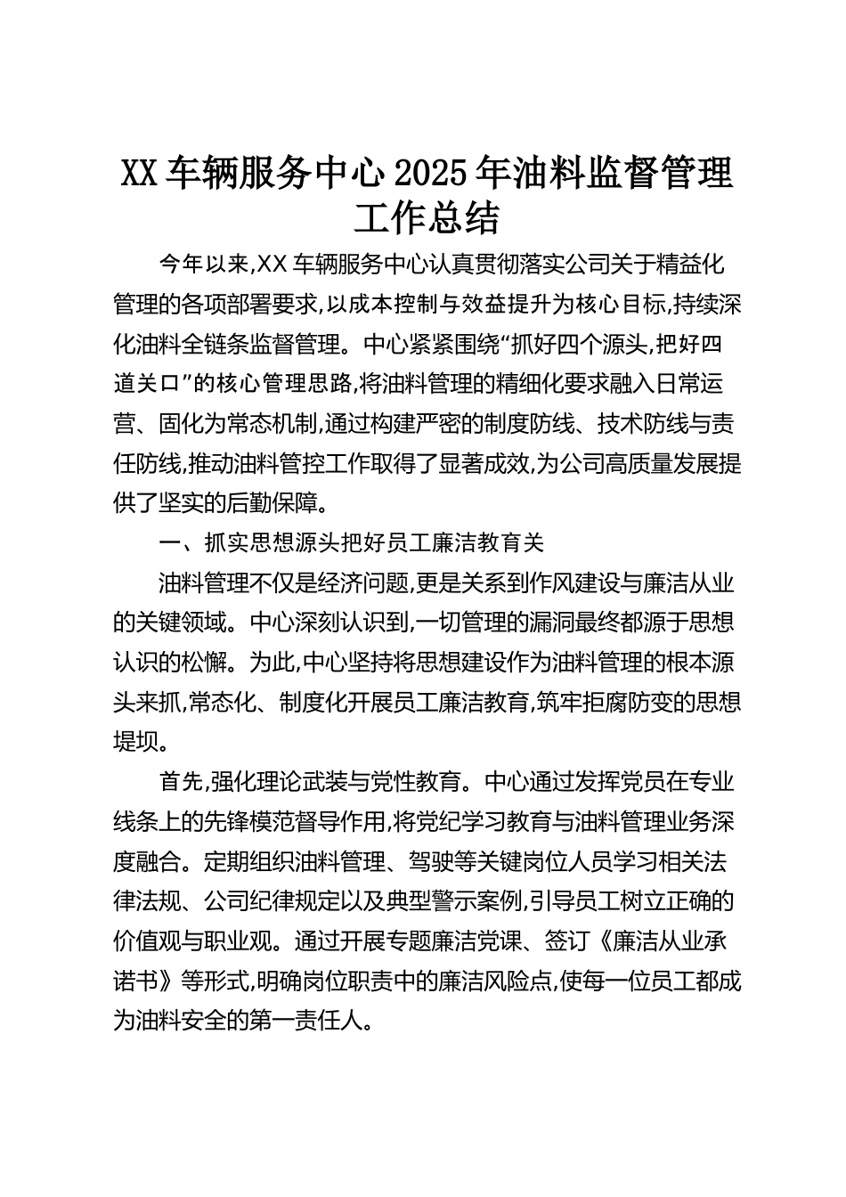 XX車輛服務(wù)中心2025年油料監(jiān)督管理工作總結(jié)今年以來,XX車輛服務(wù)中心認(rèn)真貫徹落實公司關(guān)于精益化管理的各項部署要求,以成本控制與效益提升為核心目標(biāo),持續(xù)深“化油料全鏈條監(jiān)督管理。中心緊緊圍繞抓好四個源頭,把好四”道關(guān)口的核心管理思路,將油料管理的精細(xì)化要求融入日常運營、固化為常態(tài)機制,通過構(gòu)建嚴(yán)密的制度防線、技術(shù)防線與責(zé)任防線,推動油料管控工作取得了顯著成效,為公司高質(zhì)量發(fā)展提供了堅實的后勤保障。一、抓實思想源頭把好員工廉潔教育關(guān)油料管理不僅是經(jīng)濟問題,更是關(guān)系到作風(fēng)建設(shè)與廉潔從業(yè)的關(guān)鍵領(lǐng)域。中心深刻認(rèn)識到,一切管理的漏洞最終都源于思想認(rèn)識...