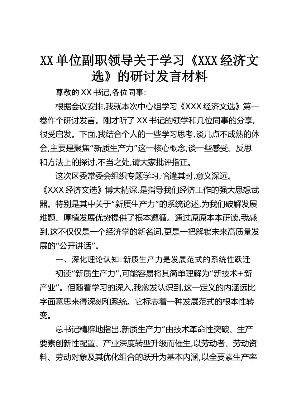 XX單位副職領導關于學習《XXX經濟文選》的研討發(fā)言材料尊敬的XX書記,各位同事:根據會議安排,我就本次中心組學習《XXX經濟文選》第一卷作個研討發(fā)言。剛才聽了XX書記的領學和幾位同事的分享,很受啟發(fā)。下面,我結合個人的一些學習思考,談幾點不成熟的體會,“”主要是聚焦新質生產力這一核心概念,談一些感受、反思和方法上的探討,不當之處,請大家批評指正。這次區(qū)委常委會組織專題學習,恰逢其時,意義深遠?!禭XX經濟文選》博大精深,是指導我們經濟工作的強大思想武“”器。特別是其中關于新質生產力的系統(tǒng)論述,為我們破解發(fā)展難題、厚植發(fā)展優(yōu)勢提供了根本遵循。通過原原本...