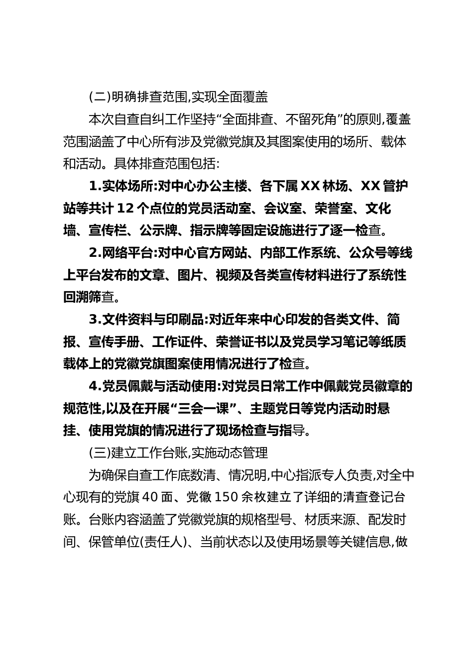 XX市XX林業(yè)資源管理中心關(guān)于規(guī)范使用黨徽黨旗自查自糾工作的報(bào)告為深入貫徹落實(shí)中共中央辦公廳印發(fā)的《中國(guó)共產(chǎn)黨黨徽黨旗條例》切實(shí)維護(hù)黨徽黨旗的尊嚴(yán),進(jìn)一步規(guī)范本單位黨徽黨旗的制作、使用和管理,根據(jù)上級(jí)黨組織的統(tǒng)一部署與要求,XX市XX林業(yè)資源管理中心黨總支于2025年7月下旬至8月上旬,在全中心范圍內(nèi)組織開(kāi)展了為期三周的黨徽黨旗規(guī)范使用專項(xiàng)自查自糾工作?,F(xiàn)將有關(guān)情況報(bào)告如下。一、工作組織與開(kāi)展情況中心黨總支對(duì)本次自查自糾工作給予高度重視,將其作為一項(xiàng)嚴(yán)肅的政治任務(wù)和加強(qiáng)黨的政治建設(shè)的重要內(nèi)容來(lái)抓,確保工作落到實(shí)處、取得實(shí)效。(一)強(qiáng)化思想引領(lǐng),迅...