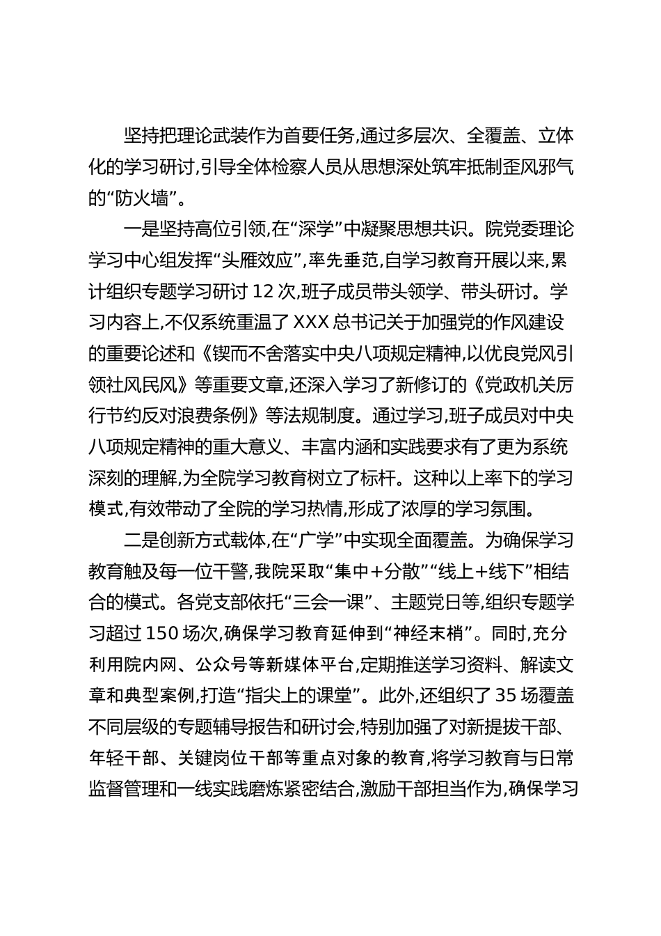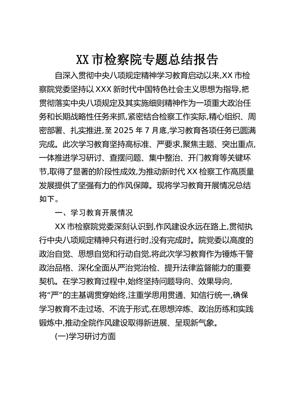 XX市檢察院專題總結(jié)報(bào)告自深入貫徹中央八項(xiàng)規(guī)定精神學(xué)習(xí)教育啟動以來,XX市檢察院黨委堅(jiān)持以XXX新時(shí)代中國特色社會主義思想為指導(dǎo),把貫徹落實(shí)中央八項(xiàng)規(guī)定及其實(shí)施細(xì)則精神作為一項(xiàng)重大政治任務(wù)和長期戰(zhàn)略性任務(wù)來抓,緊密結(jié)合檢察工作實(shí)際,精心組織、周密部署、扎實(shí)推進(jìn),至2025年7月底,學(xué)習(xí)教育各項(xiàng)任務(wù)已圓滿完成。此次學(xué)習(xí)教育堅(jiān)持高標(biāo)準(zhǔn)、嚴(yán)要求,聚焦主題、突出重點(diǎn),一體推進(jìn)學(xué)習(xí)研討、查擺問題、集中整治、開門教育等關(guān)鍵環(huán)節(jié),取得了顯著的階段性成效,為推動新時(shí)代XX檢察工作高質(zhì)量發(fā)展提供了堅(jiān)強(qiáng)有力的作風(fēng)保障?,F(xiàn)將學(xué)習(xí)教育開展情況總結(jié)如下。一、學(xué)習(xí)教育開展情況...