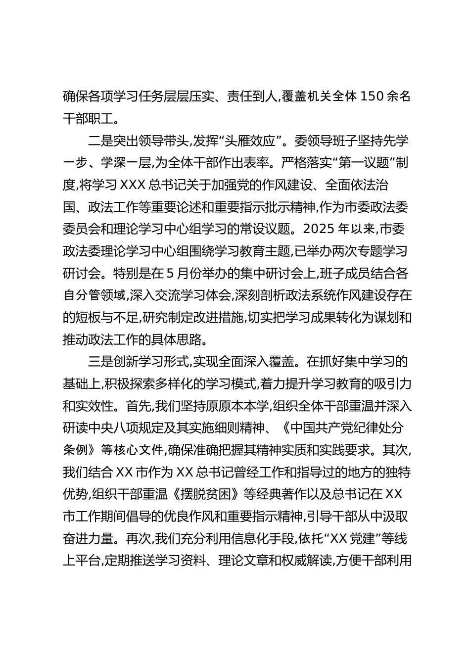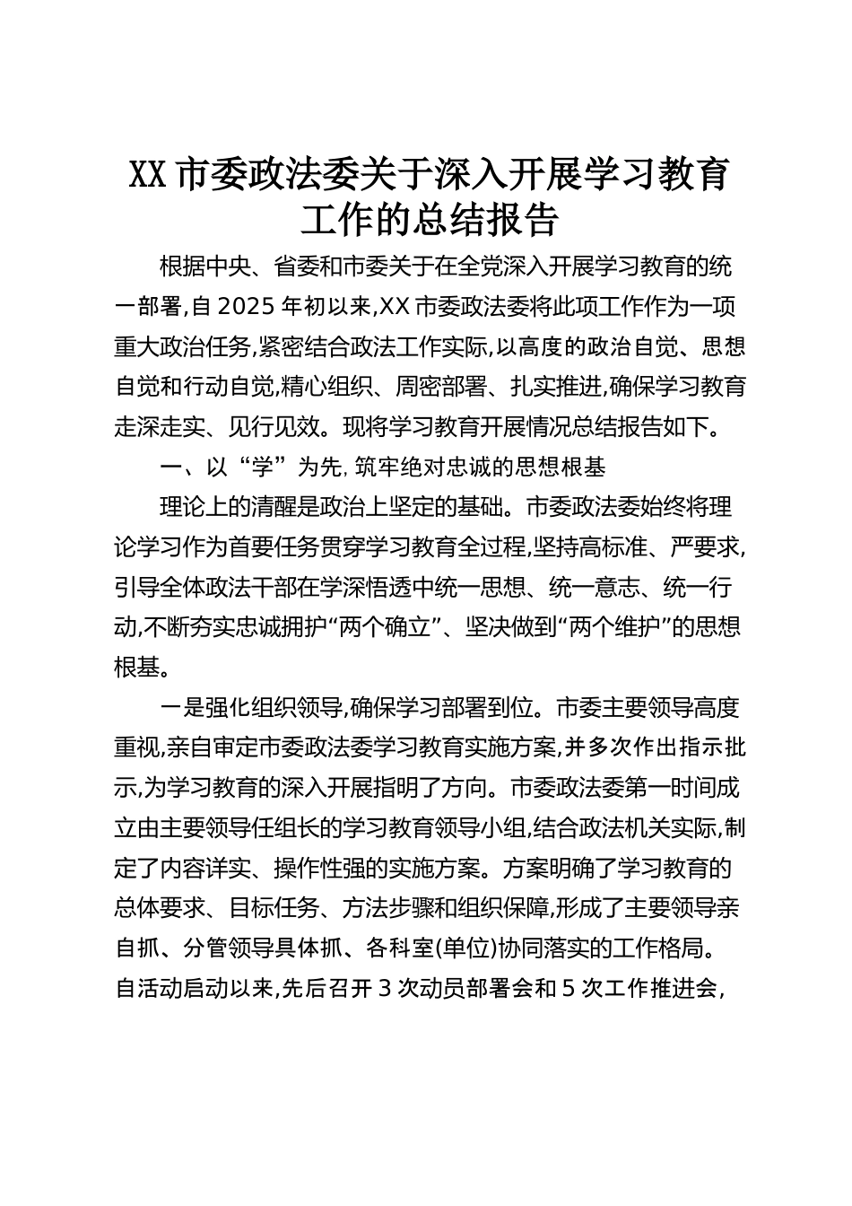 XX市委政法委關(guān)于深入開展學(xué)習(xí)教育工作的總結(jié)報告根據(jù)中央、省委和市委關(guān)于在全黨深入開展學(xué)習(xí)教育的統(tǒng)一部署,自2025年初以來,XX市委政法委將此項工作作為一項重大政治任務(wù),緊密結(jié)合政法工作實際,以高度的政治自、思想覺自和行自覺動覺,精心組織、周密部署、扎實推進,確保學(xué)習(xí)教育走深走實、見行見效?,F(xiàn)將學(xué)習(xí)教育開展情況總結(jié)報告如下。一、以“學(xué)”為先,筑牢絕對忠誠的思想根基理論上的清醒是政治上堅定的基礎(chǔ)。市委政法委始終將理論學(xué)習(xí)作為首要任務(wù)貫穿學(xué)習(xí)教育全過程,堅持高標準、嚴要求,引導(dǎo)全體政法干部在學(xué)深悟透中統(tǒng)一思想、統(tǒng)一意志、統(tǒng)一行動,“”“”不斷夯...