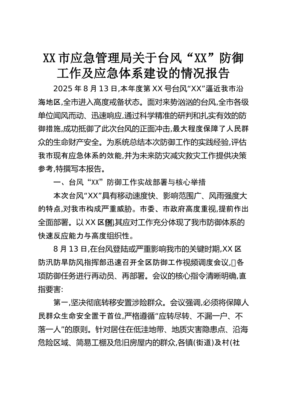 XX市應(yīng)急管理局關(guān)于臺風(fēng)“XX”防御工作及應(yīng)急體系建設(shè)的情況報告2025年8月13日,本年度第XX“號臺風(fēng)XX”逼近我市沿海地區(qū),全市進入高度戒備狀態(tài)。面對來勢洶洶的臺風(fēng),全市各級單位聞風(fēng)而動、迅速響應(yīng),通過科學(xué)精準的研判和扎實有效的防御措施,成功抵御了此次臺風(fēng)的正面沖擊,最大程度保障了人民群眾的生命財產(chǎn)安全。為系統(tǒng)總結(jié)本次防御工作的實踐經(jīng)驗,評估我市有急體系的效能現(xiàn)應(yīng),并為未來防災(zāi)減災(zāi)救災(zāi)工作提供決策參考,特撰寫本報告。一、臺風(fēng)“XX”防御工作實戰(zhàn)部署與核心舉措“本次臺風(fēng)XX”具有移動速度快、影響范圍廣、風(fēng)雨強度大的特點,我市構(gòu)成重威。市委、市政府高...