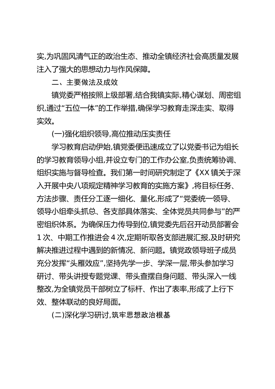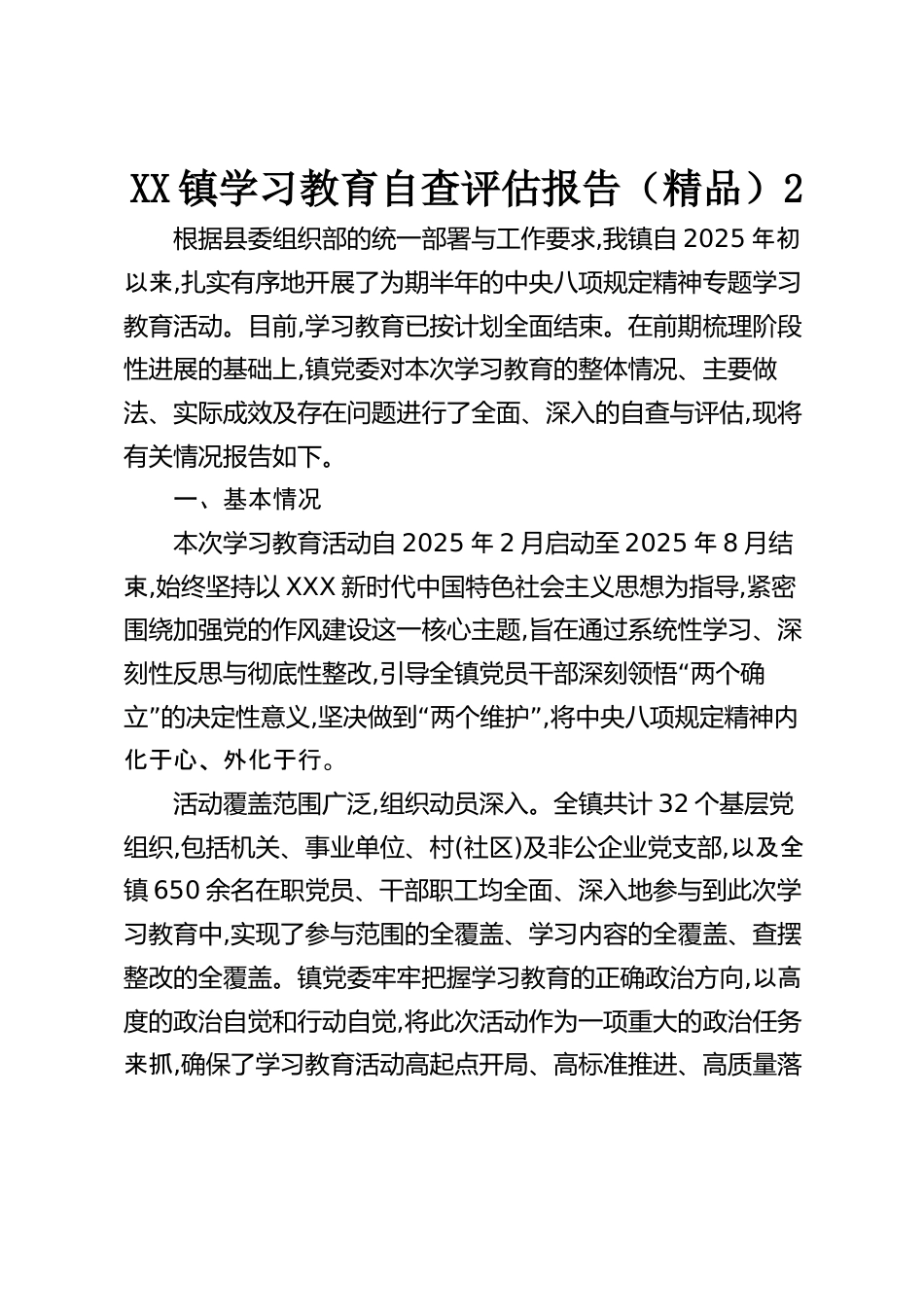 XX鎮(zhèn)學(xué)習(xí)教育自查評(píng)估報(bào)告(精品)2根據(jù)縣委組織部的統(tǒng)一部署與工作要求,我鎮(zhèn)自2025年初以來,扎實(shí)有序地開展了為期半年的中央八項(xiàng)規(guī)定精神專題學(xué)習(xí)教育活動(dòng)。目前,學(xué)習(xí)教育已按計(jì)劃全面結(jié)束。在前期梳理階段性進(jìn)展的基礎(chǔ)上,鎮(zhèn)黨委對(duì)本次學(xué)習(xí)教育的整體情況、主要做法、實(shí)際成效及存在問題進(jìn)行了全面、深入的自查與評(píng)估,現(xiàn)將有關(guān)情況報(bào)告如下。一、基本情況本次學(xué)習(xí)教育活動(dòng)自2025年2月啟動(dòng)至2025年8月結(jié)束,始終堅(jiān)持以XXX新時(shí)代中國特色社會(huì)主義思想為指導(dǎo),緊密圍繞加強(qiáng)黨的作風(fēng)建設(shè)這一核心主題,旨在通過系統(tǒng)性學(xué)習(xí)、深刻性反思與徹底性整改,“引導(dǎo)全鎮(zhèn)黨員干部深刻領(lǐng)悟...