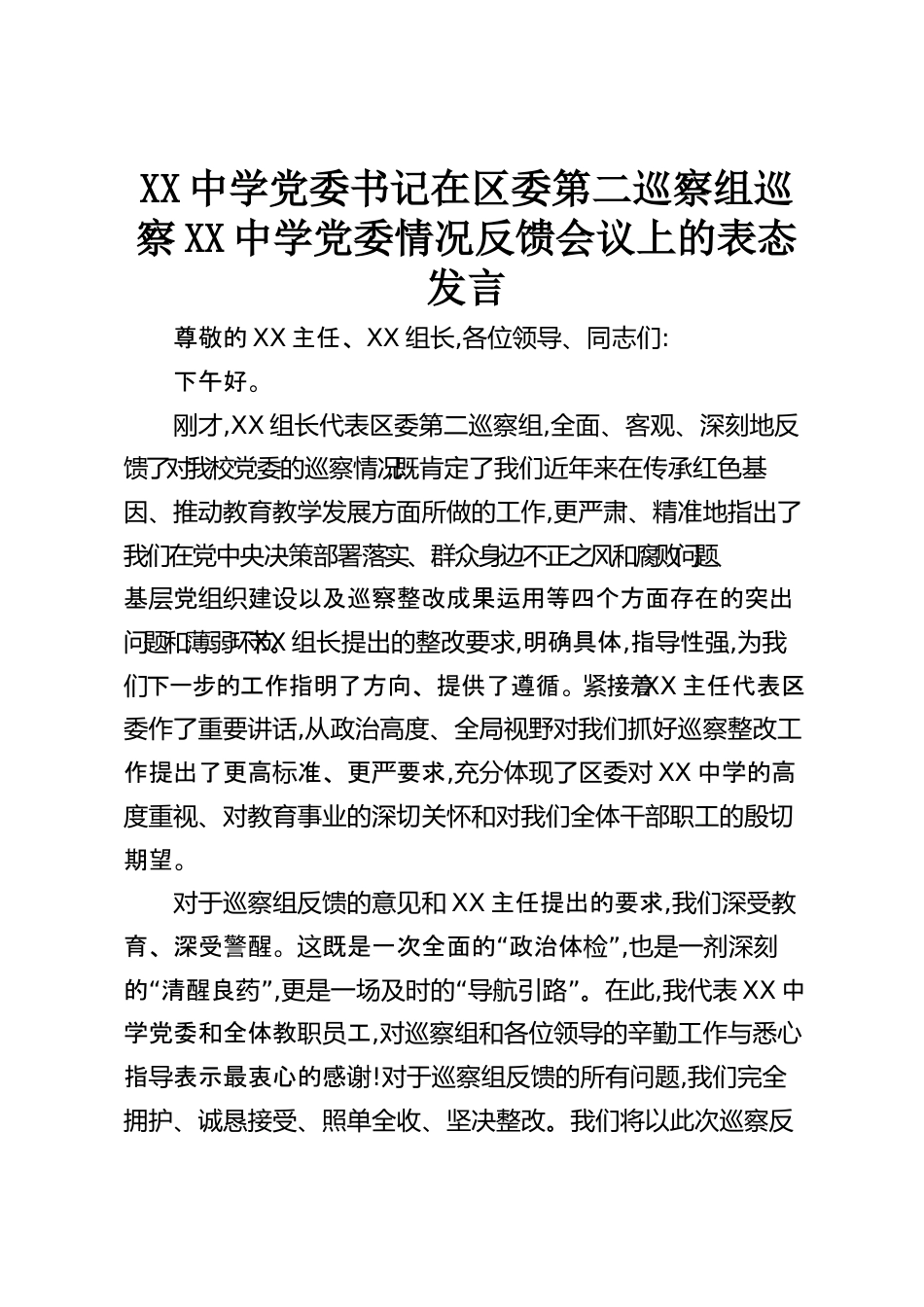 XX中學(xué)黨委書記在區(qū)委第二巡察組巡察XX中學(xué)黨委情況反饋會議上的表態(tài)發(fā)言