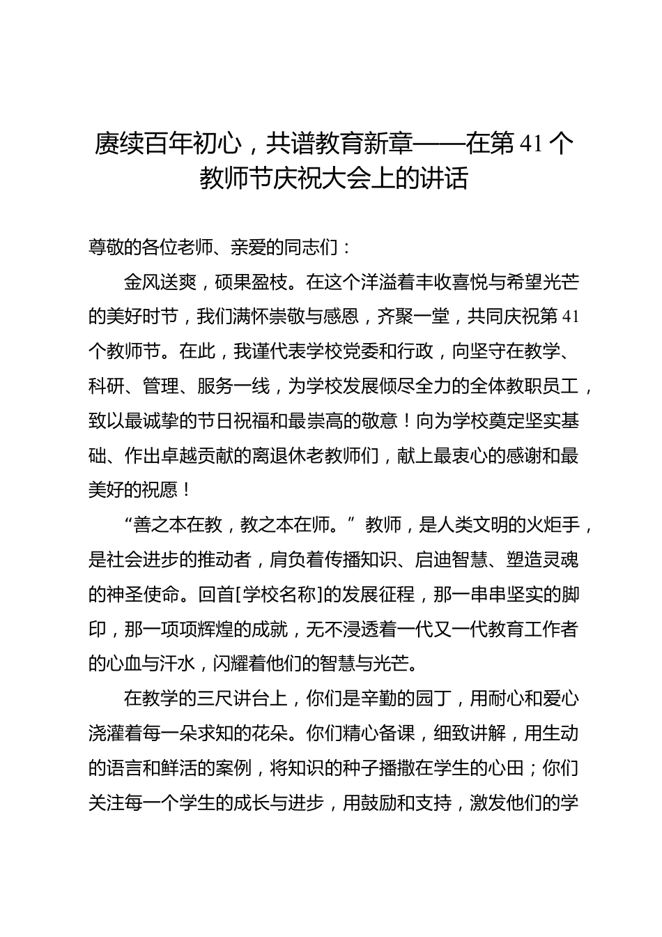 賡續(xù)百年初心,共譜教育新章——在第41個(gè)教師節(jié)慶祝大會(huì)上的講話