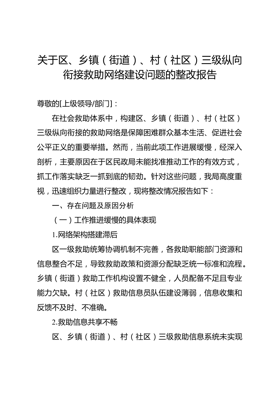 關于區(qū)、鄉(xiāng)鎮(zhèn)(街道)、村(社區(qū))三級縱向銜接救助網(wǎng)絡建設問題的整改報告